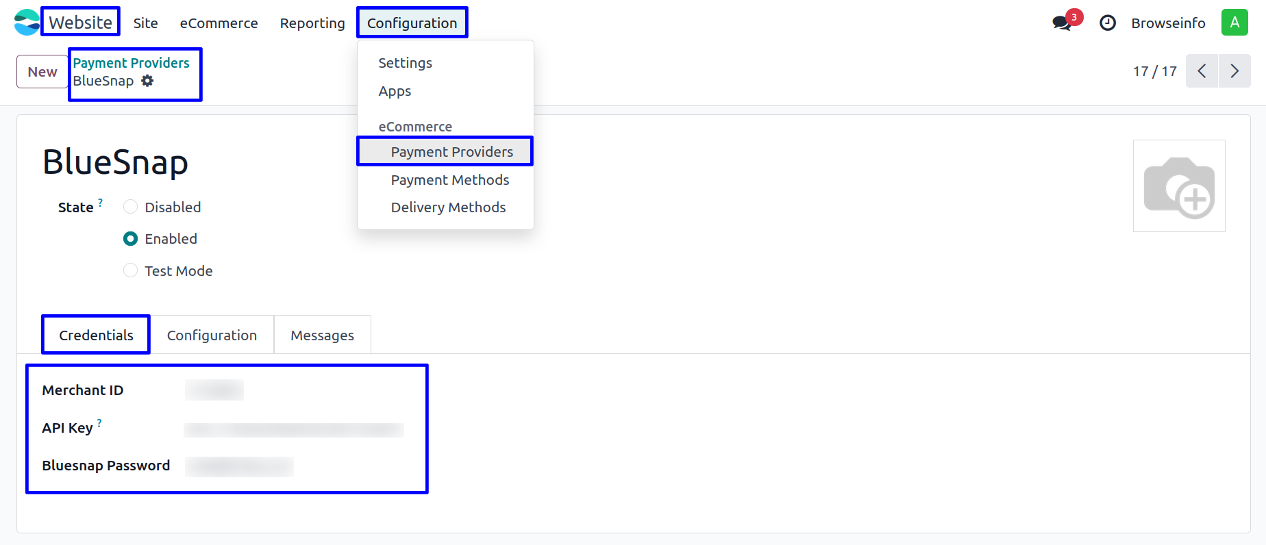 User need to enter Bluesnap Merchant id, Api Key and Bluesnap Password in Bluesnap payment provider in Odoo.