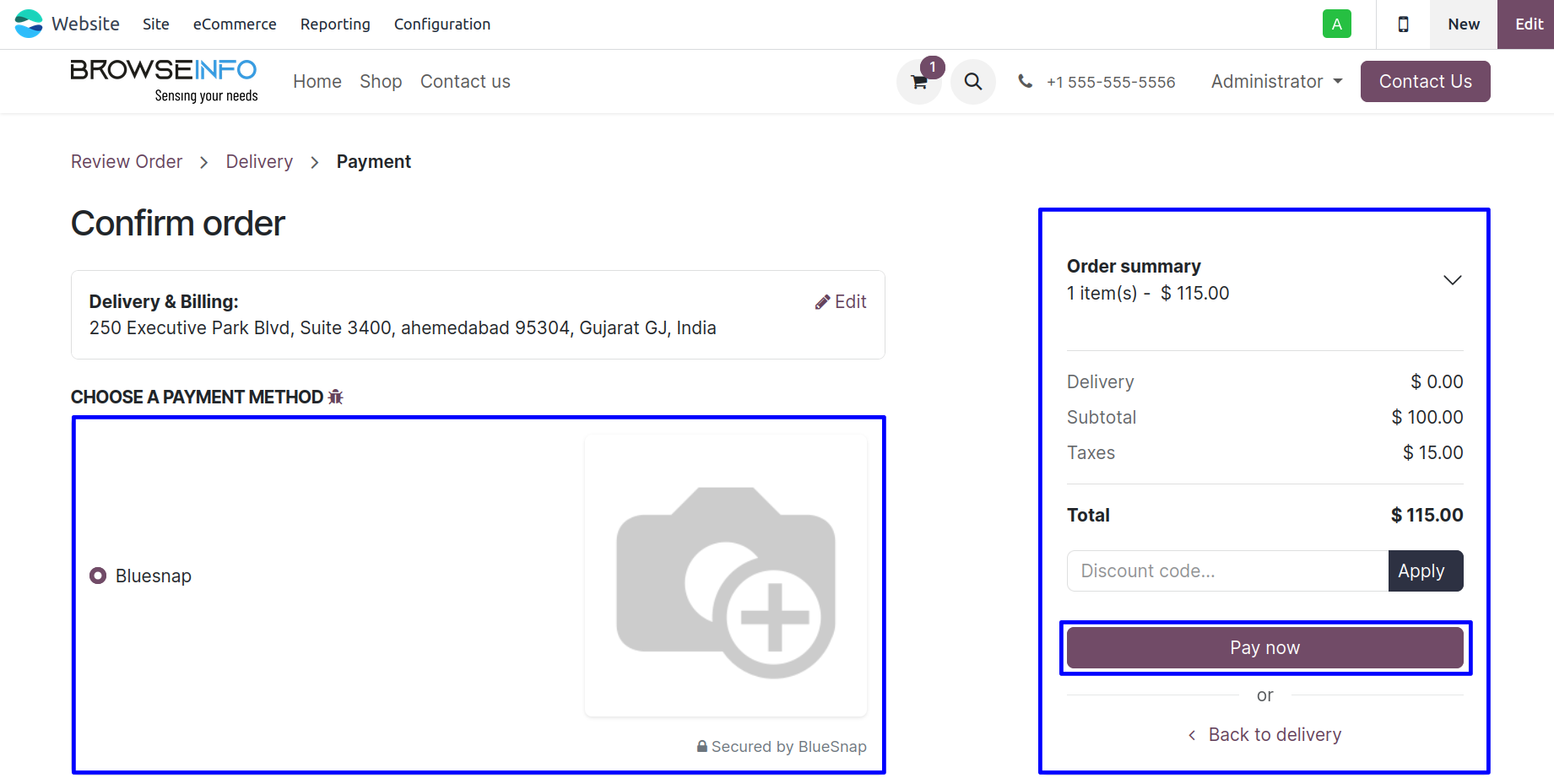 Once configured, customers will see bluesnap as a payment option when confirming their order on your Odoo website.