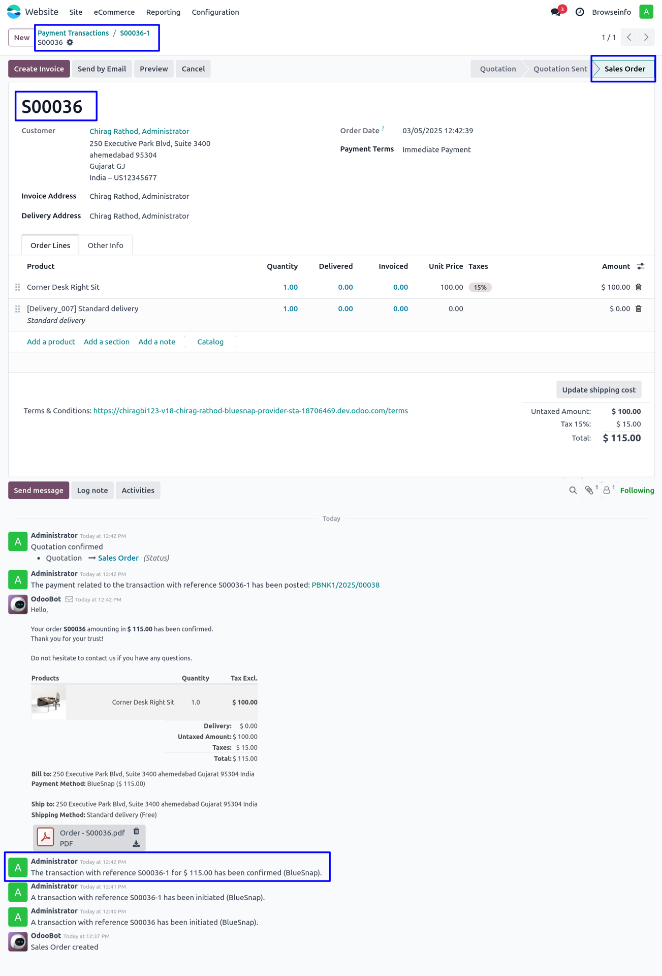 Fig. shows the sale order with Total Amount of ordered products and payment detail.