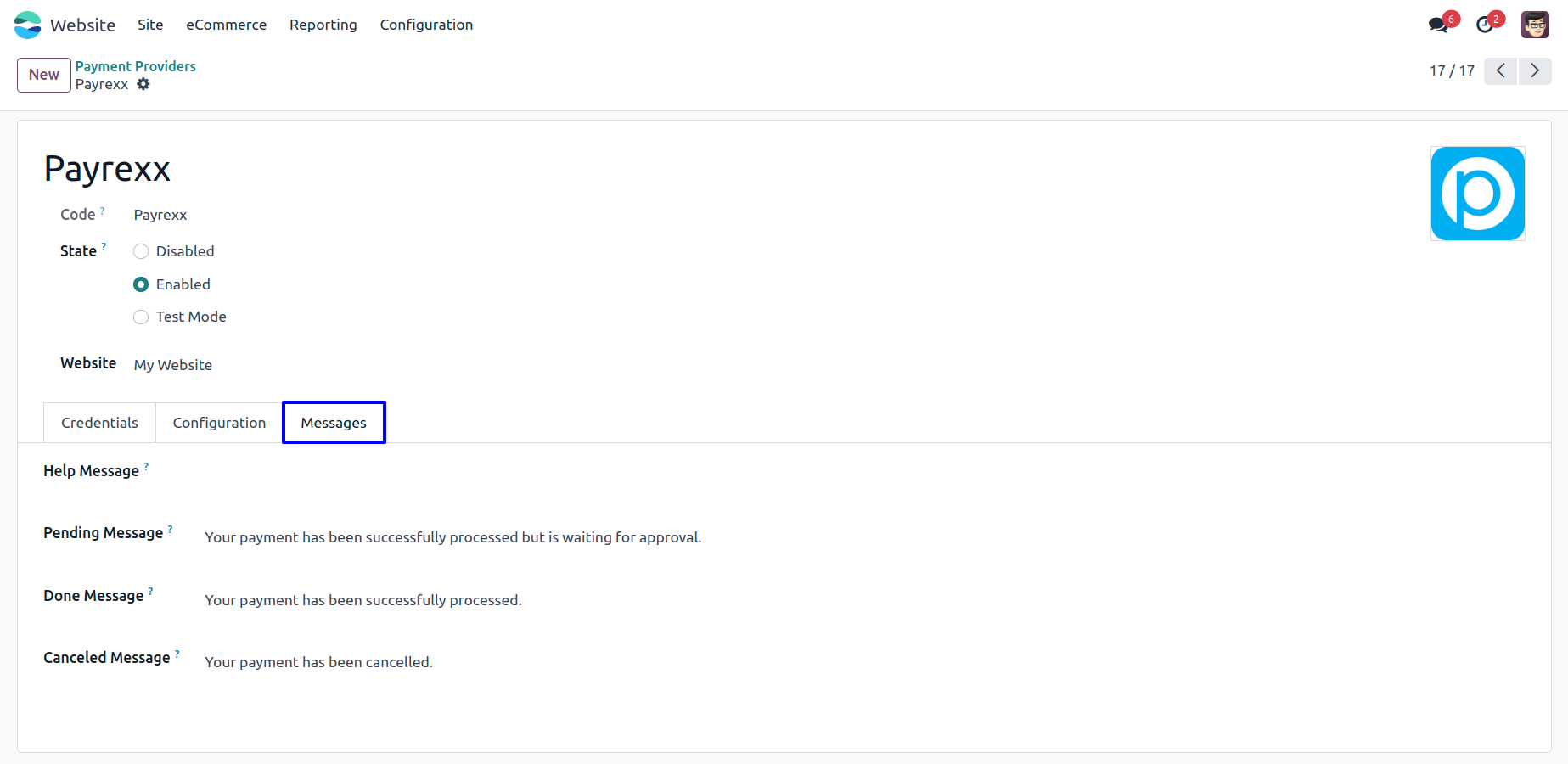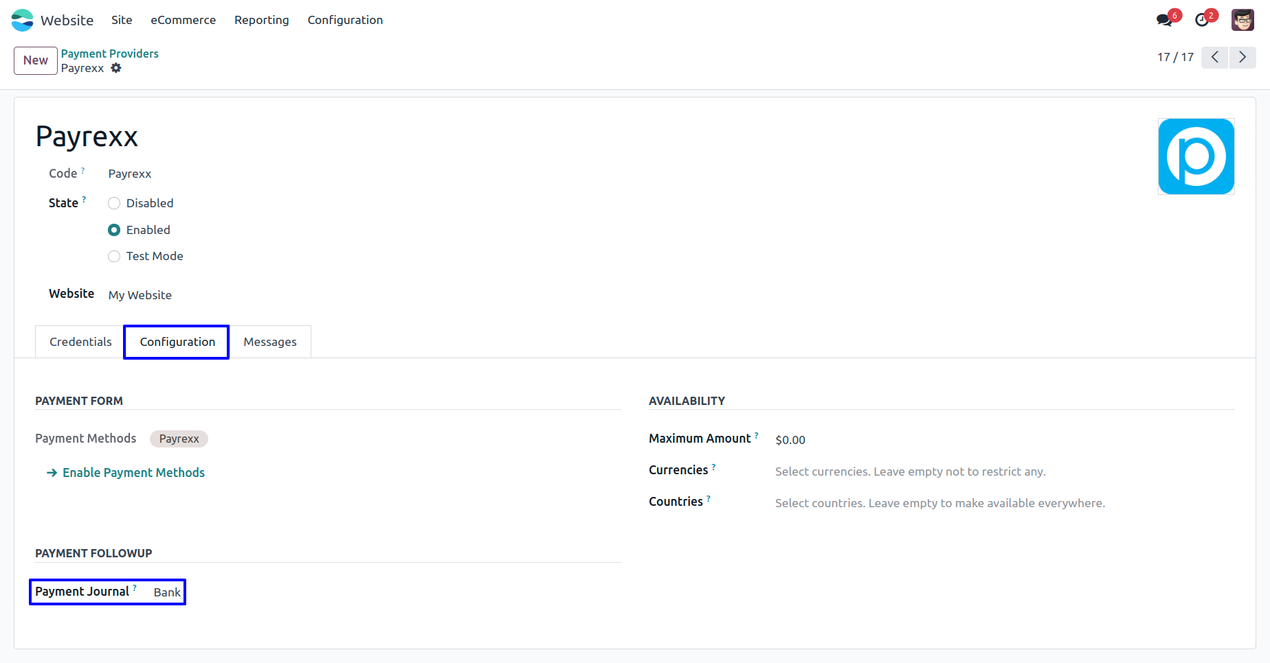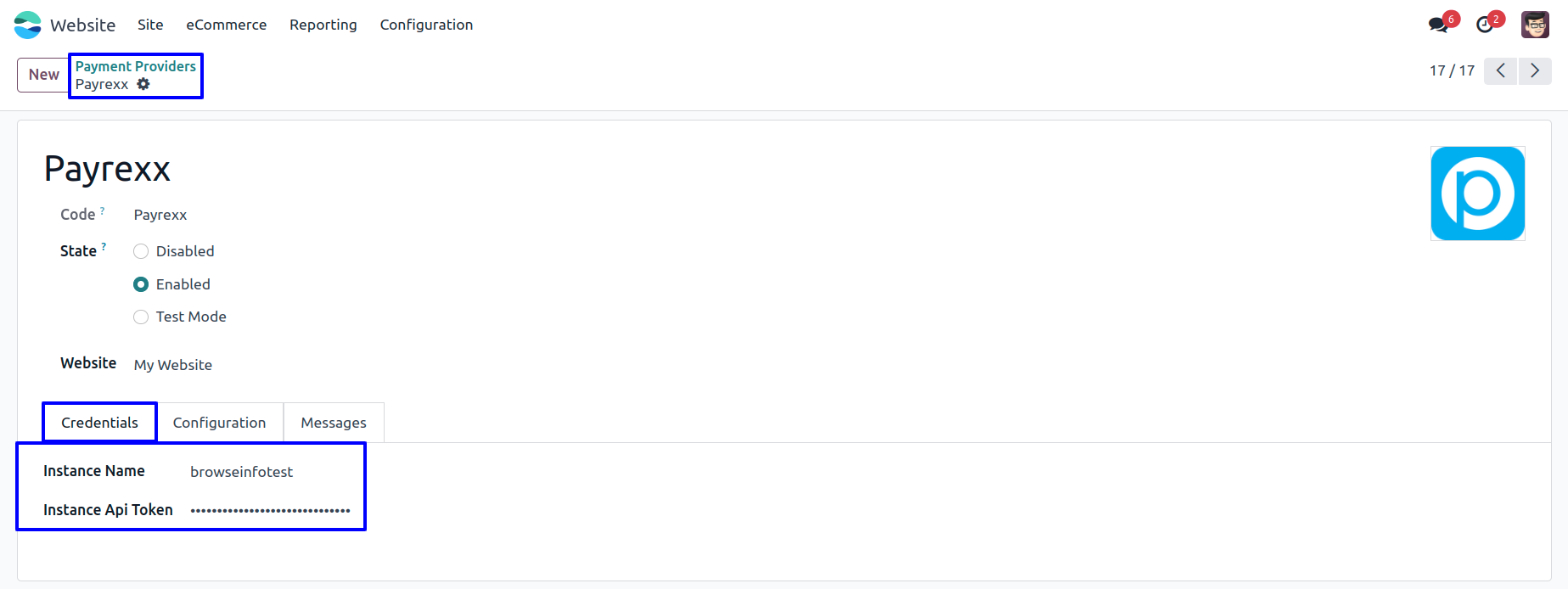 User need to enter Instance name and Instance API Token in Payrexx payment provider in Odoo.
