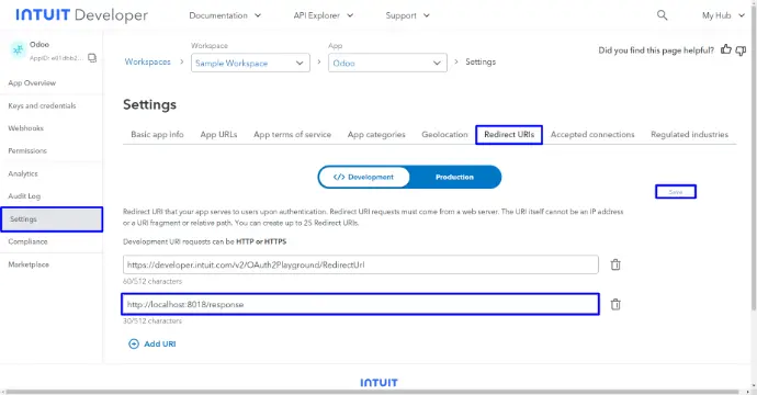 Under Settings -> Redirected URLs tab, Enter your Odoo page URL and save it.