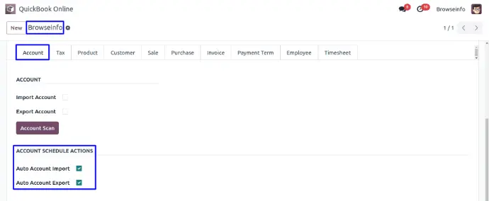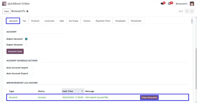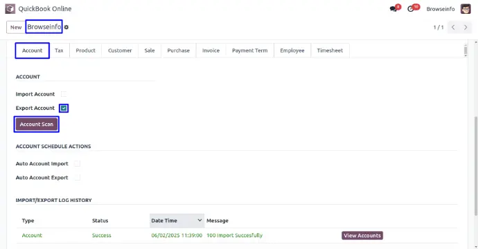 Goto "Account" tab and enable export account option then click on "Account Scan" button to sync account data into QuickBook.
