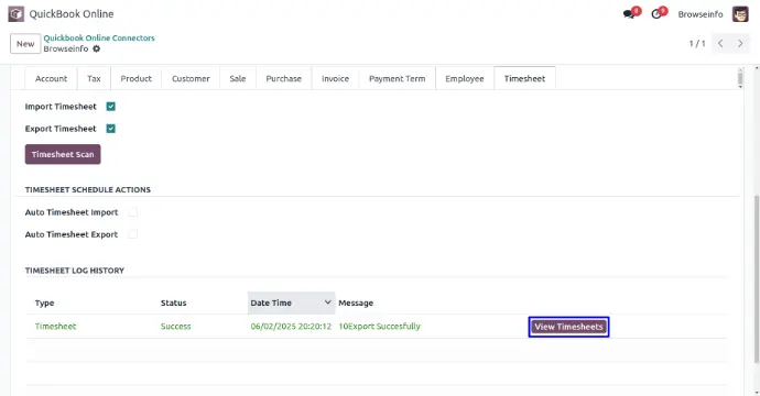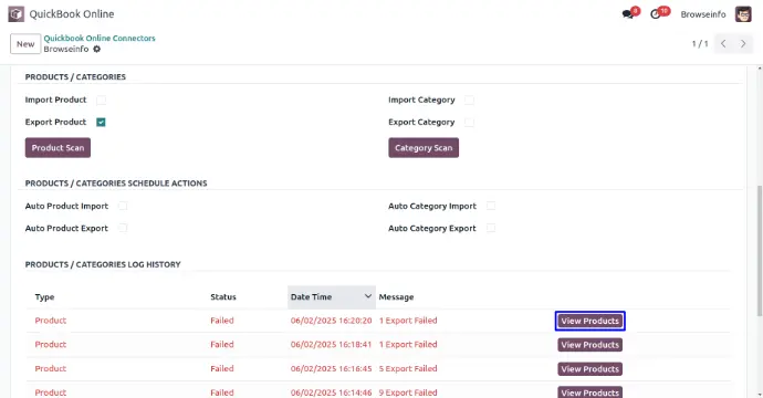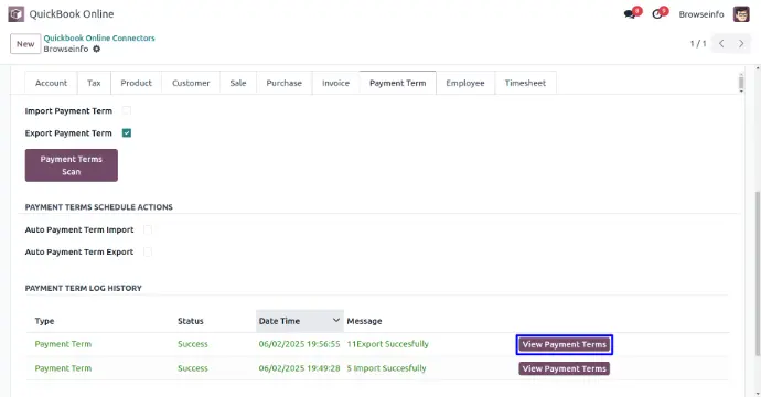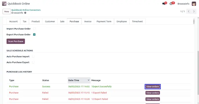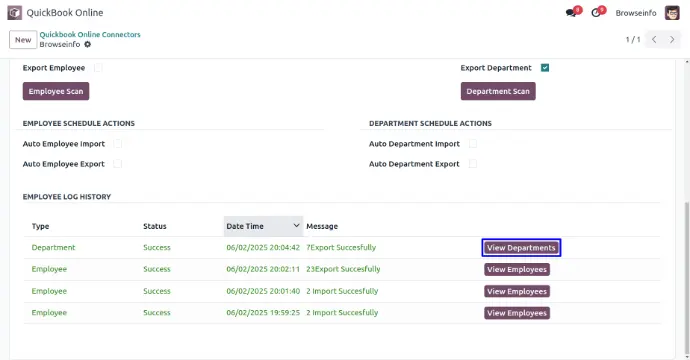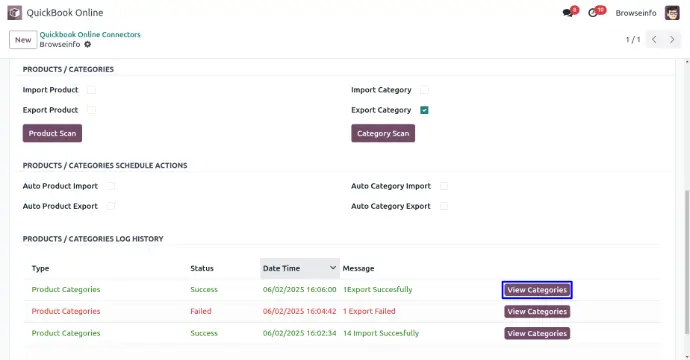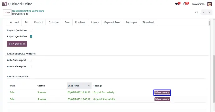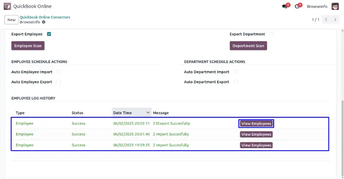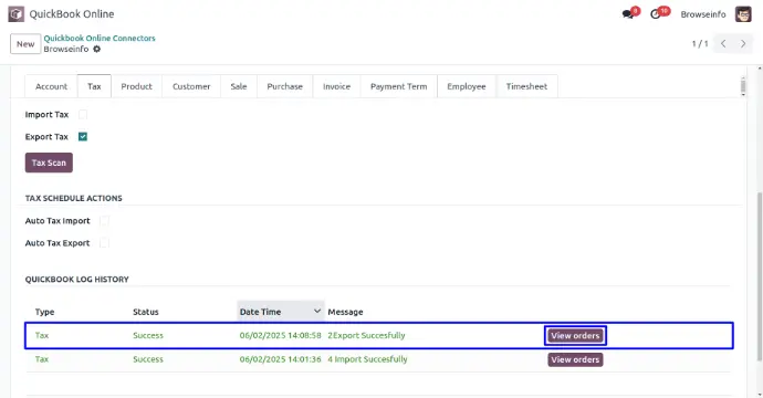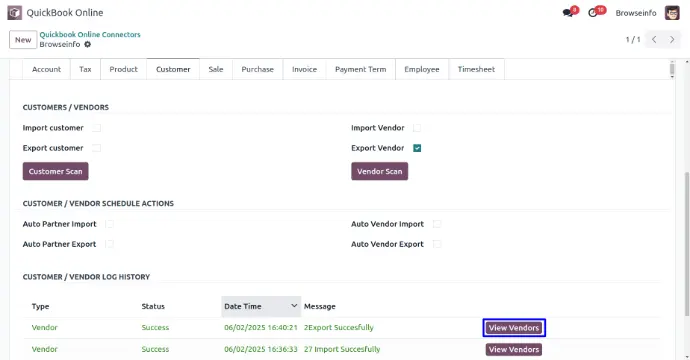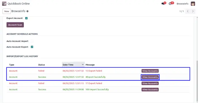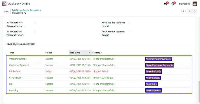 User can see the log history of import/export invoice, bill, credit note, refunds, customer payment and vendor payment and also view records.