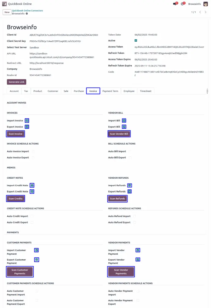 Goto "Invoice" tab and user have options to enable import/export invoice, bill, credit note, refunds, customer payment and vendor payment then scan it.