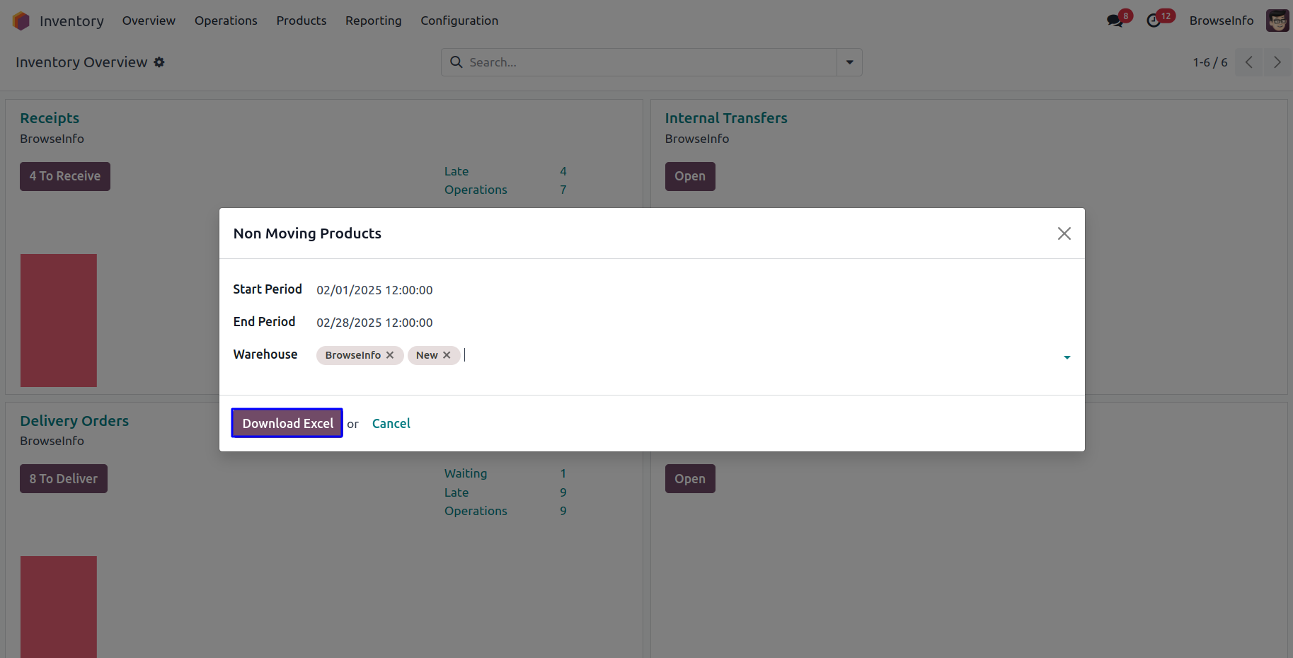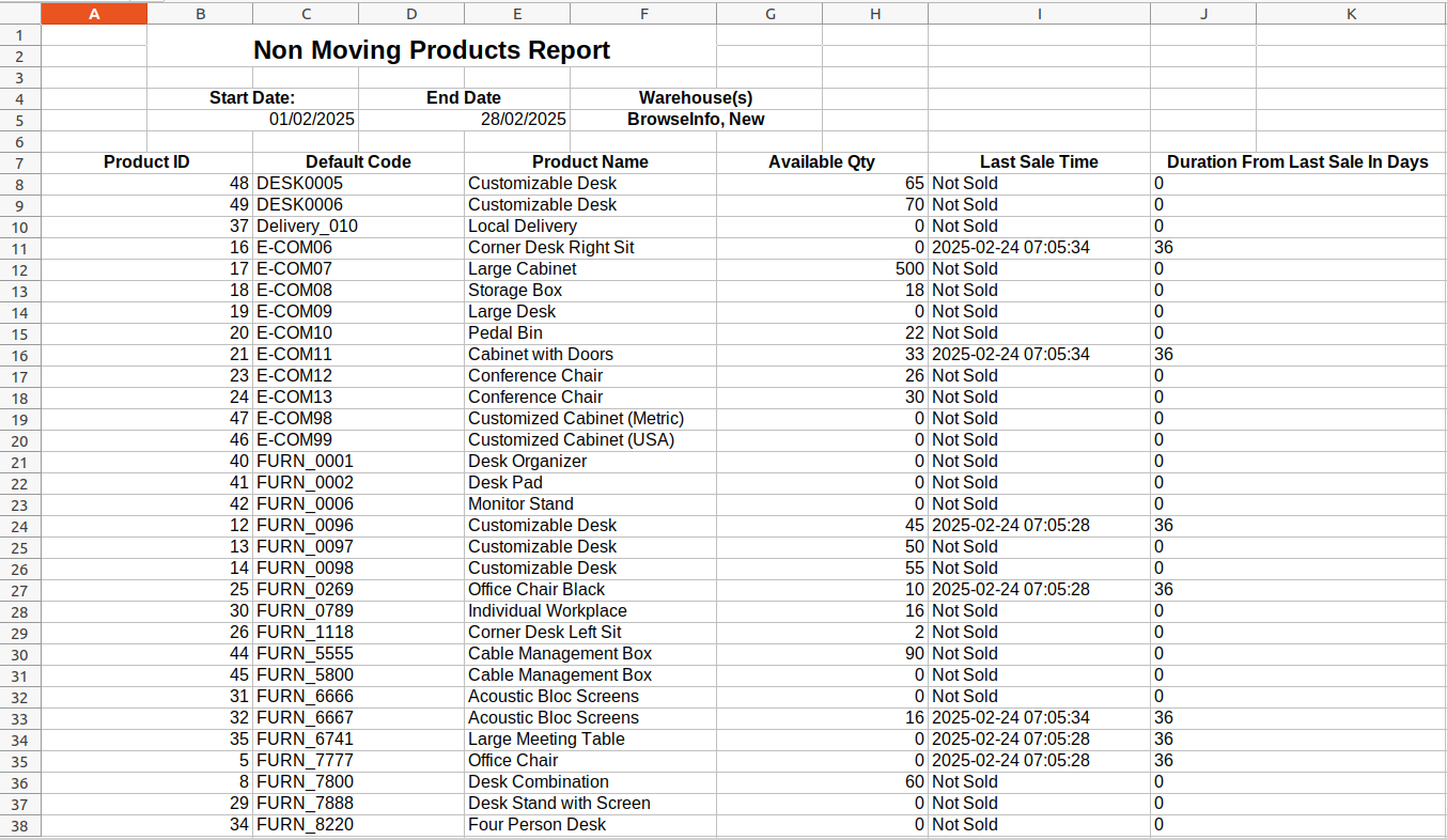 User can also print non moving products report for selected warehouse between start and end period in XLS format.