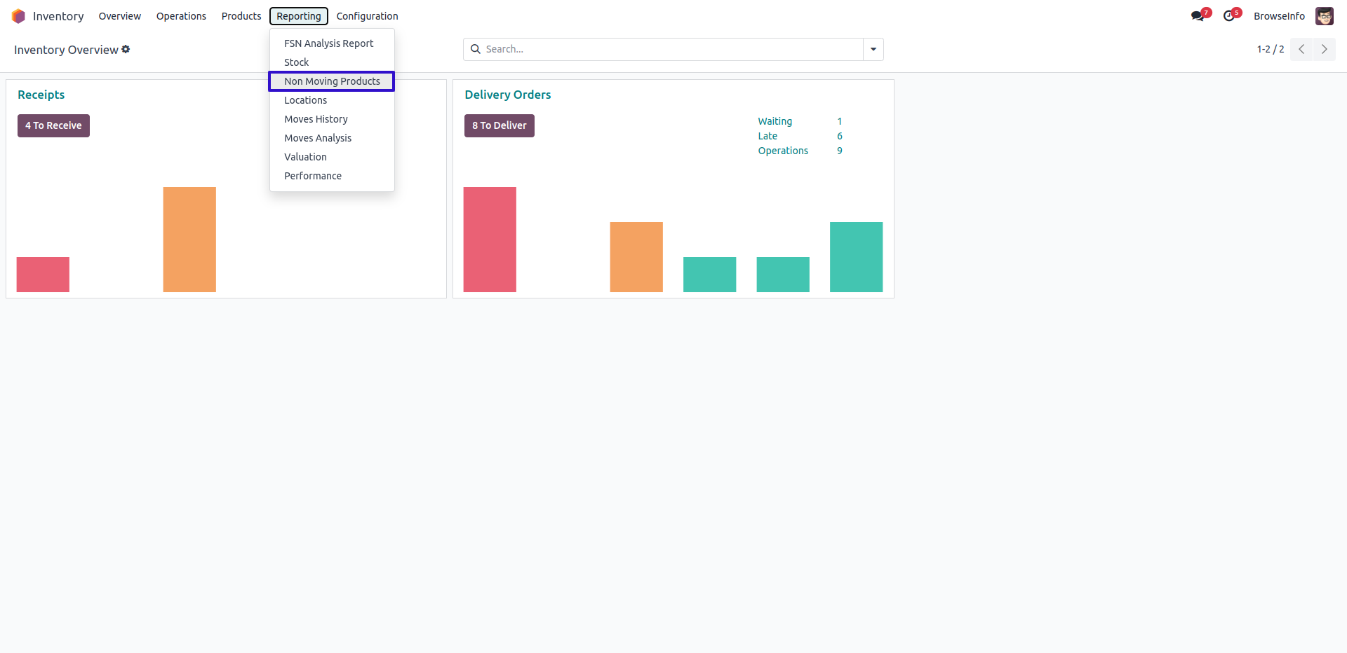 Under Inventory > Reporting menu user can see "Non Moving Products" menu.