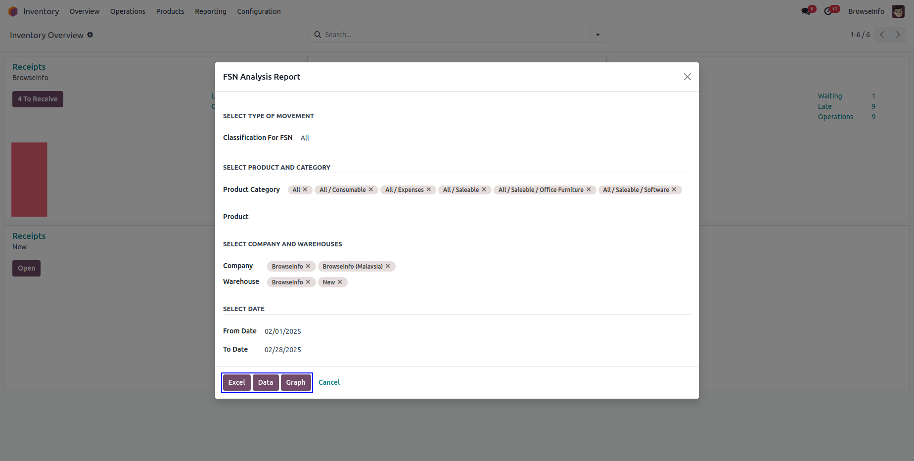 Inventory FSN - Fast, Slow and Non moving Analysis Reports odoo app helps users to identify fast moving, slow moving and non moving products from stock that helps to make proper decisions for stock managers. Users can print stock FSN analysis reports using different filters like, date, product and product category, FSN classification, company and warehouse and view FSN analysis report, graph view and also can print report in excel format. Users can also generate Non Moving Products reports separately between start & end period from all selected warehouses in excel format.