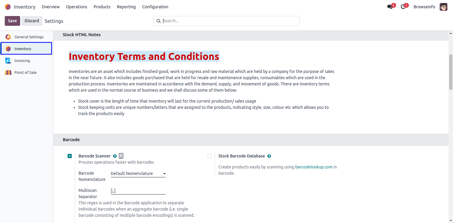 Under Inventory > Configuration > Settings menu user can configure and add html notes.