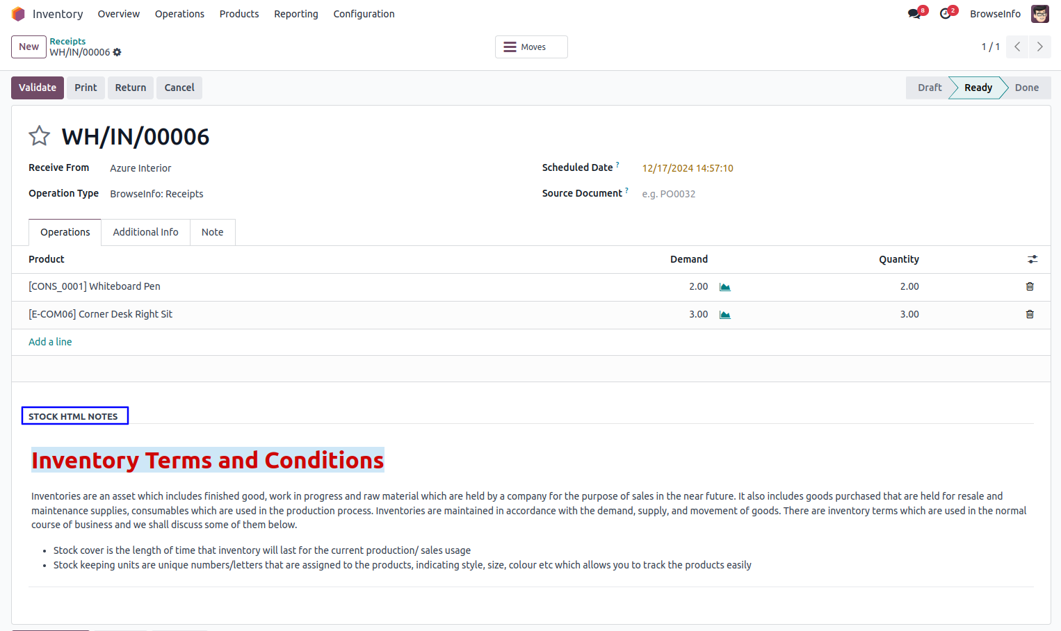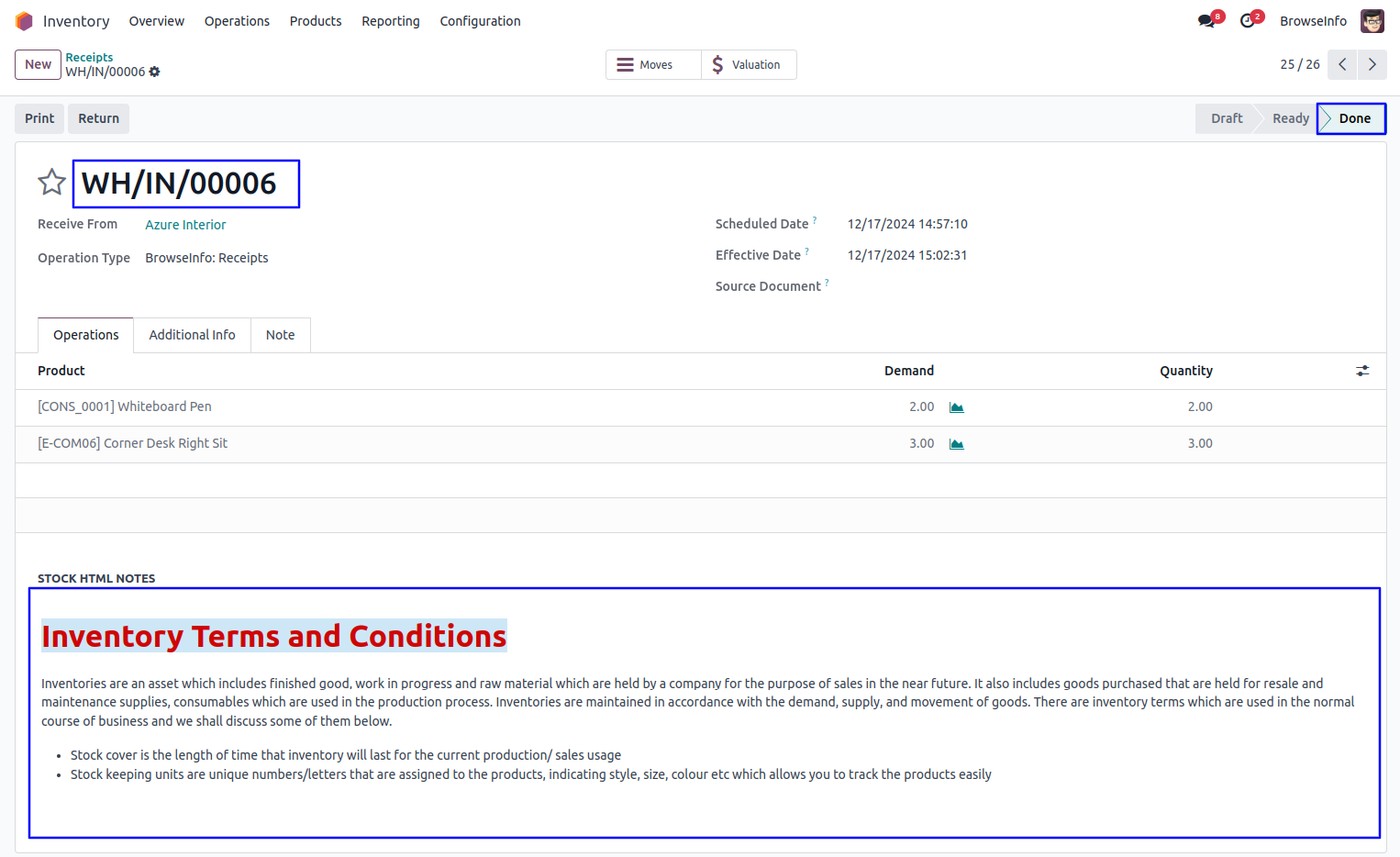 Stock Picking Operations HTML Notes Odoo App helps users to configure HTML notes and automatically add to stock in draft and warehouse operations also print on picking operation report and delivery slip report.