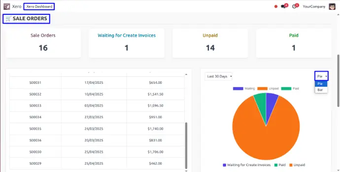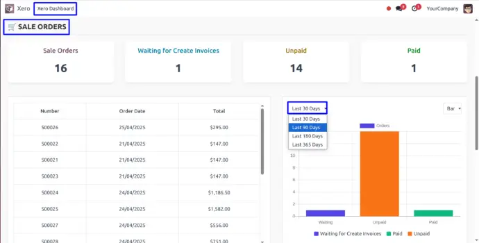 In Xero Dashboard, User can view generated Sale Order Details with paid, unpaid, table of SO and Bar chart and filter with given days
