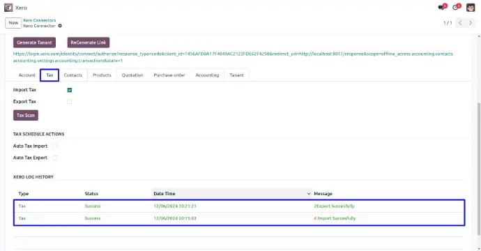 User can view xero log history of import and export taxes.