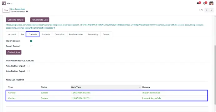 User can view xero log history of import and export contacts.