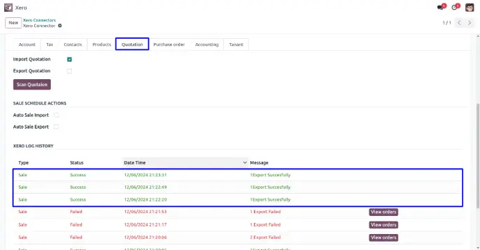 User can view xero log history of import and export quotations.