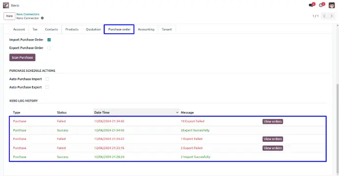 User can view xero log history of import and export purchase order.
