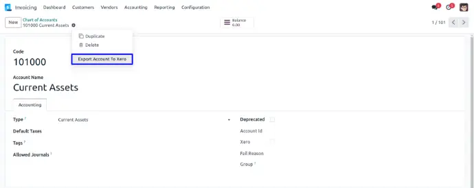 In action, User can export specific account to xero.