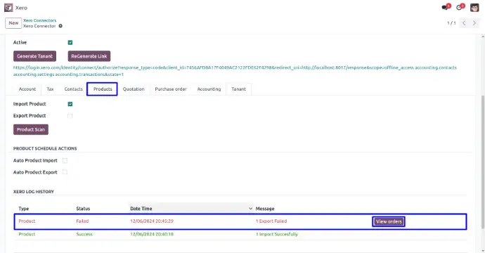 User can view xero log history of import and export products.