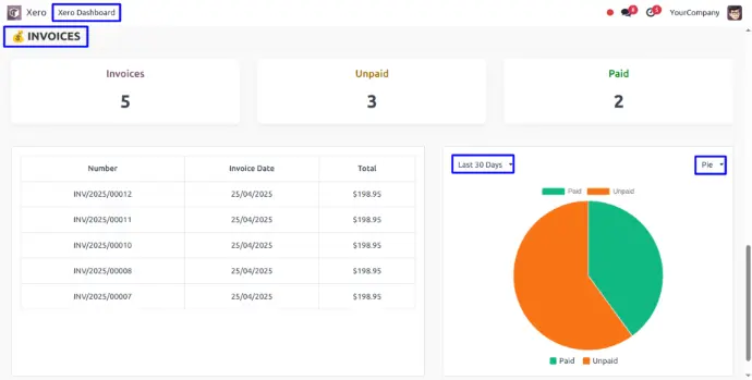 In Xero Dashboard, User can view generated Invoice Order Details with paid, unpaid, table of Invoice and Bar/Pie chart and filter with given days