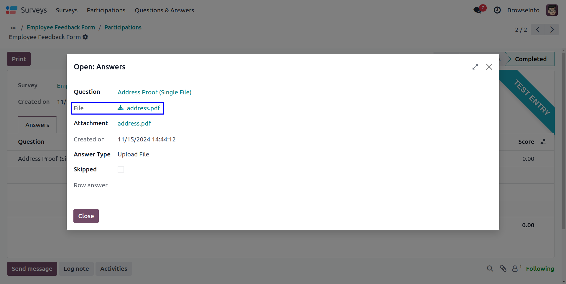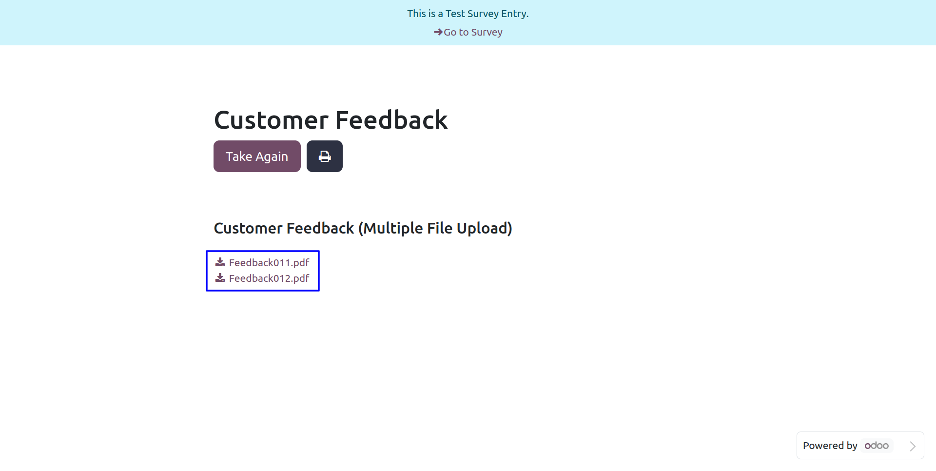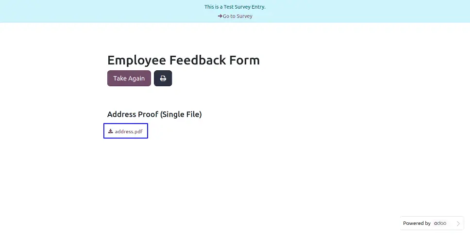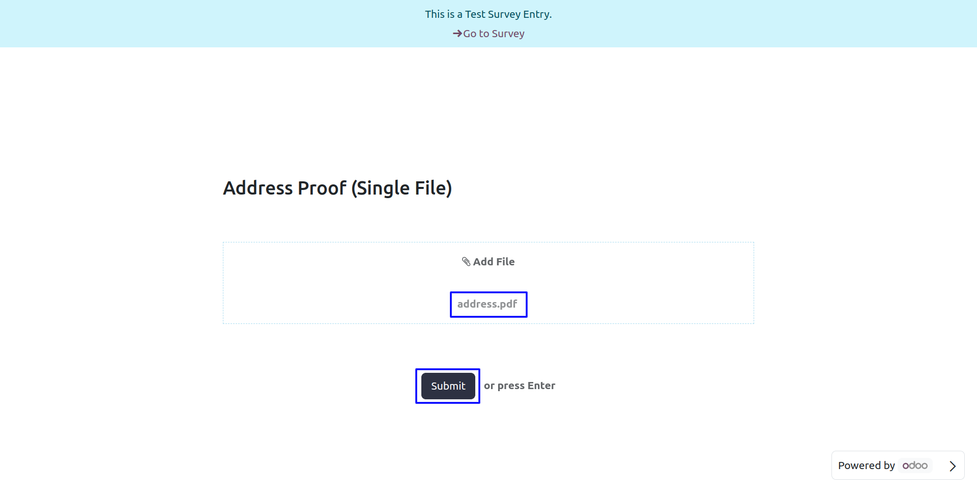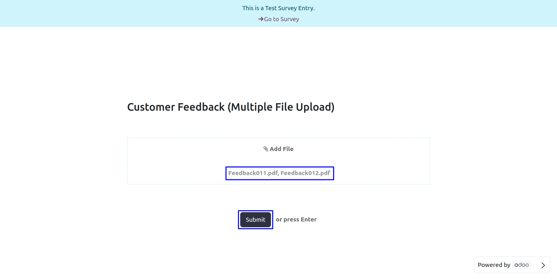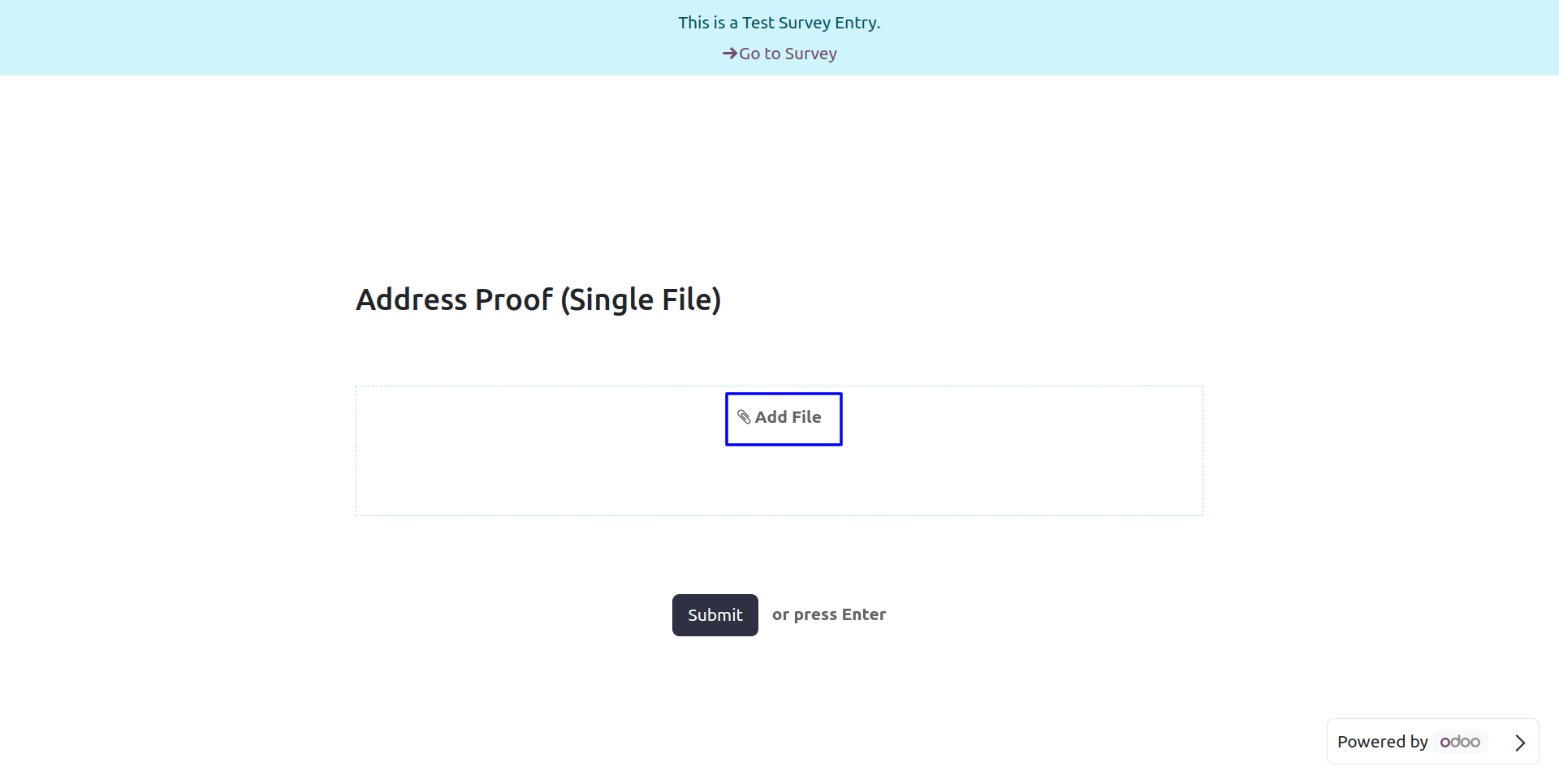 Survey Multi File Upload odoo app adds single or multiple file upload options in survey. Users can add questions in survey as file upload option as answer, participant can upload file as survey answer id upload more then one file warning will show. If you enable the "Upload Multiple file" option then participants can add multiple files as attachments. Participants can view all uploaded attachments by clicking the "review your answer" button on survey. Users can also see all uploaded attachments on survey answers.
