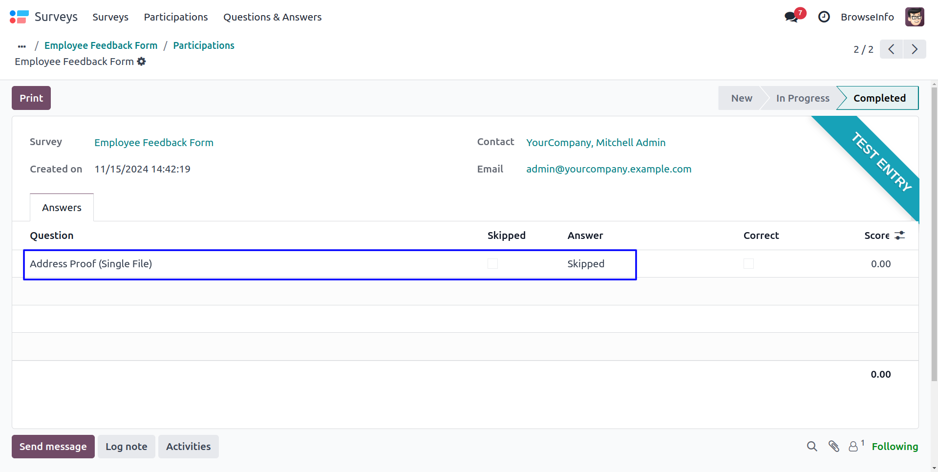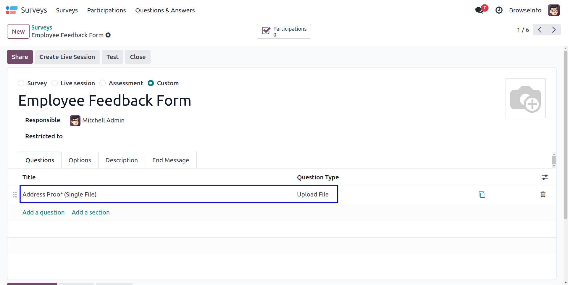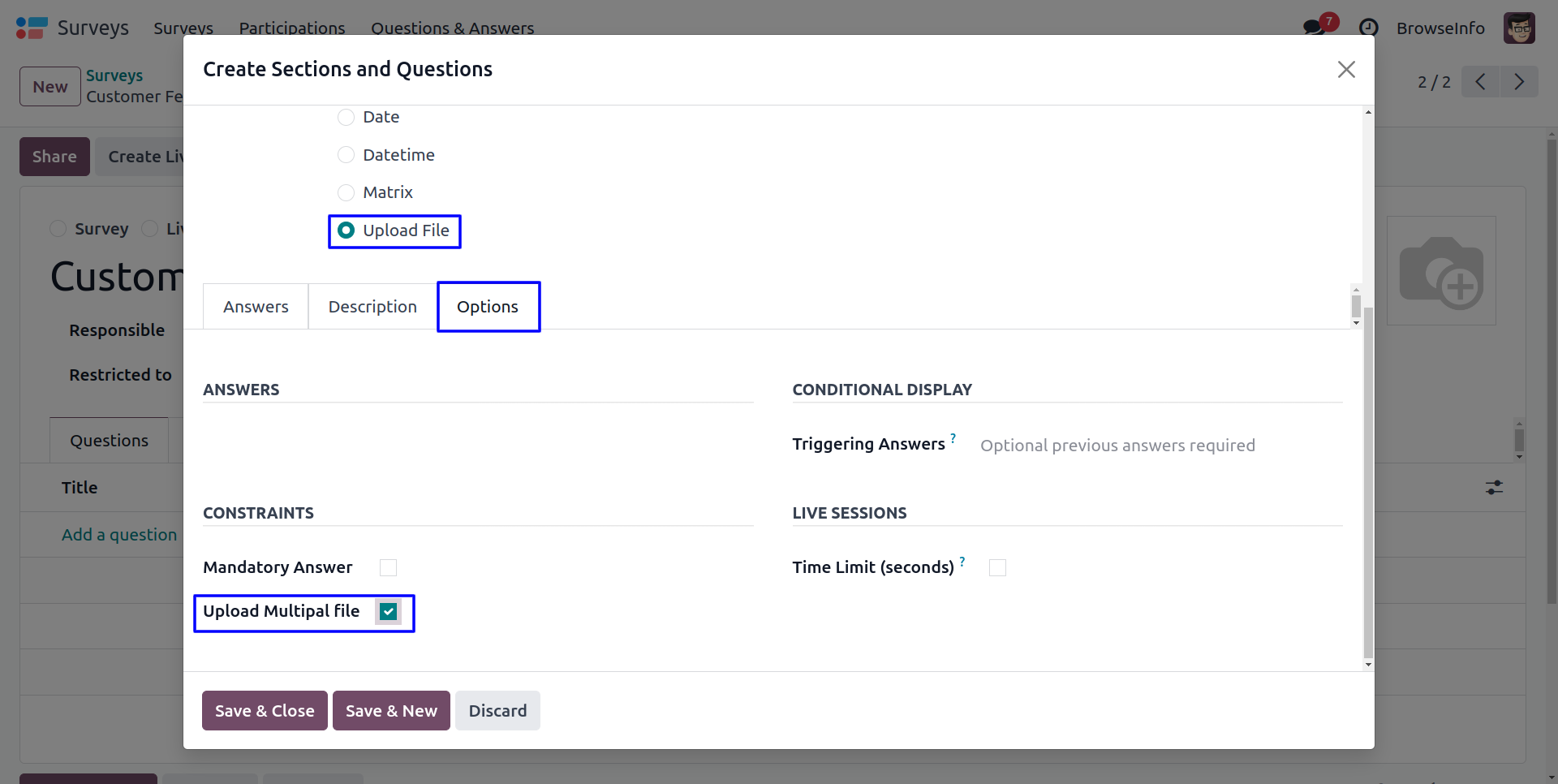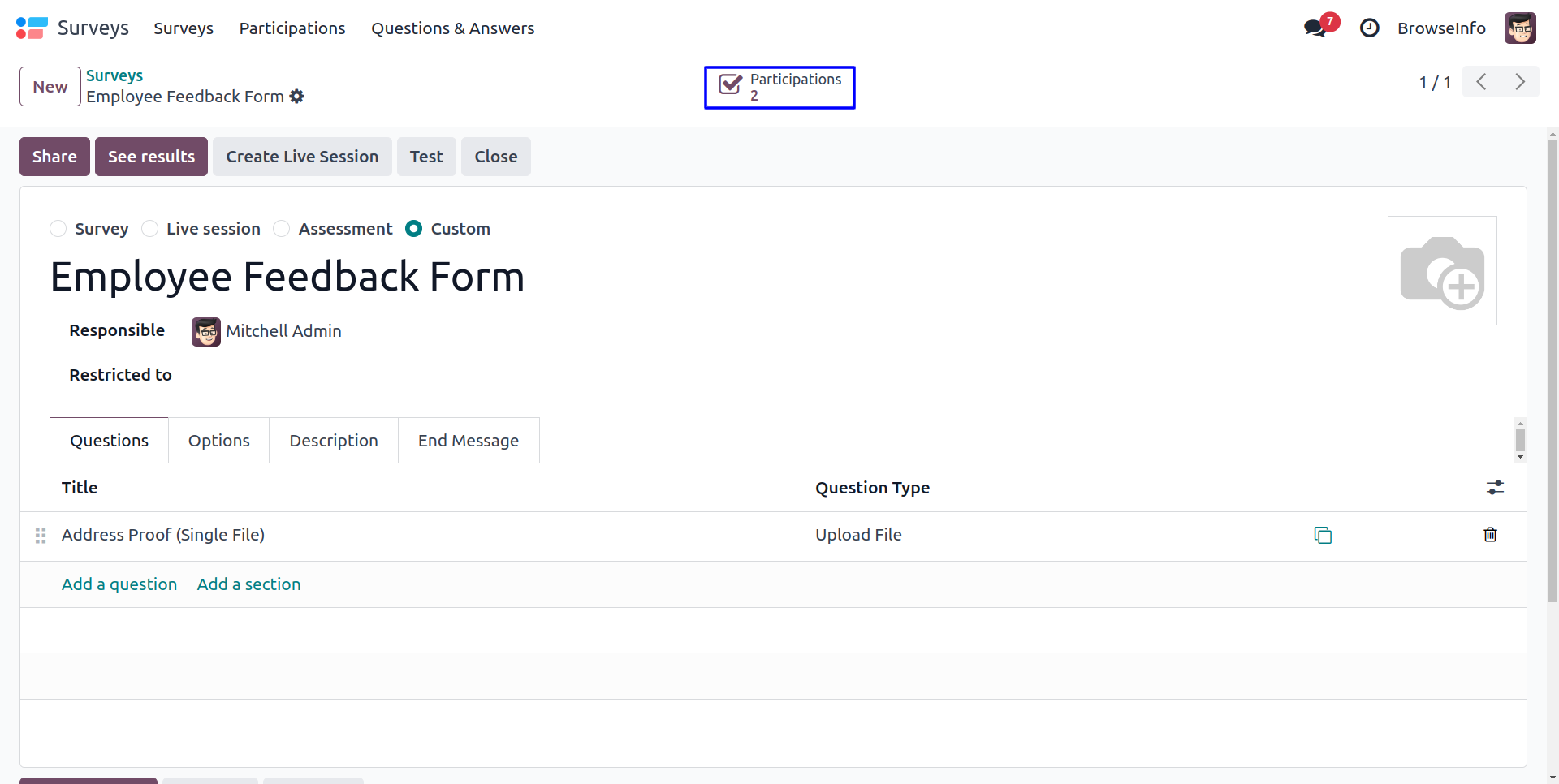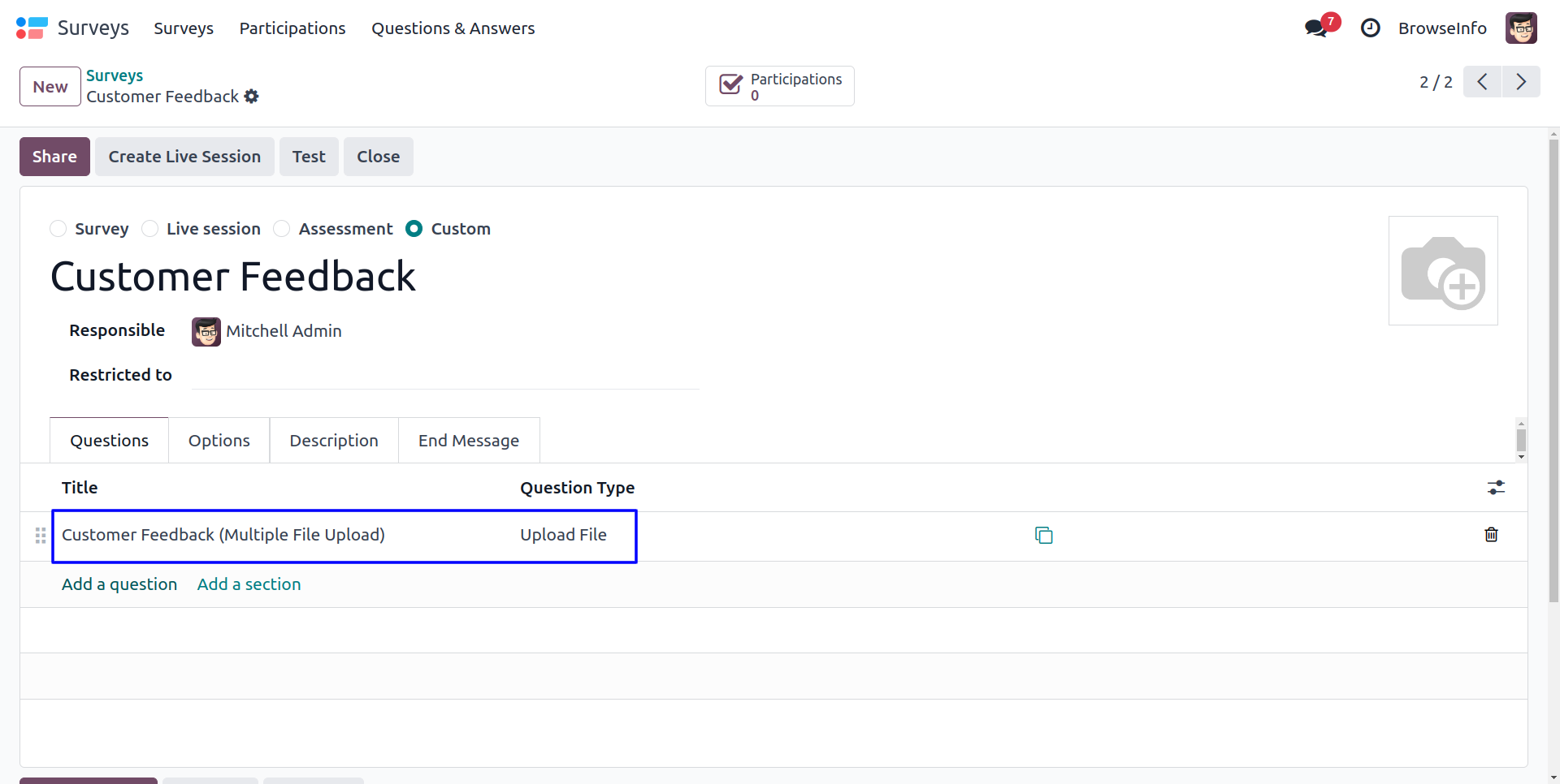 Survey Multi File Upload odoo app adds single or multiple file upload options in survey. Users can add questions in survey as file upload option as answer, participant can upload file as survey answer id upload more then one file warning will show. If you enable the "Upload Multiple file" option then participants can add multiple files as attachments. Participants can view all uploaded attachments by clicking the "review your answer" button on survey. Users can also see all uploaded attachments on survey answers.
