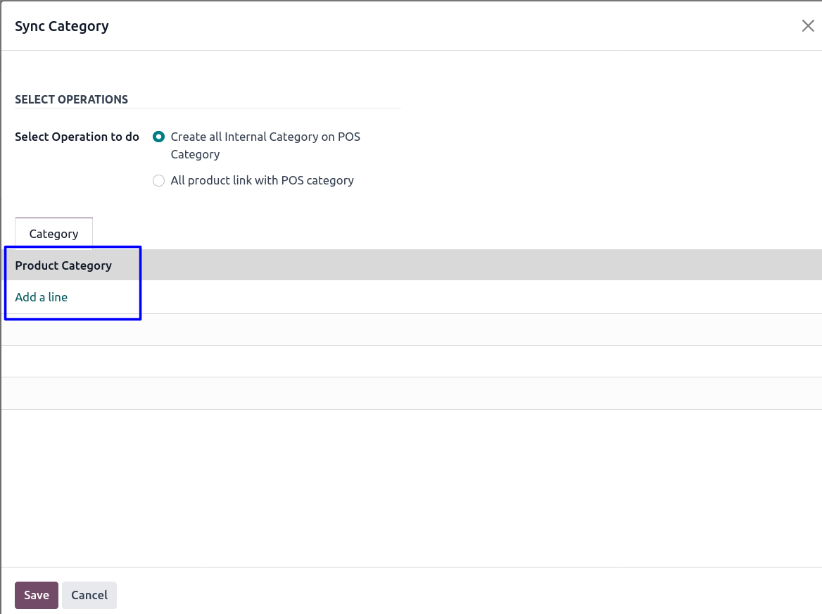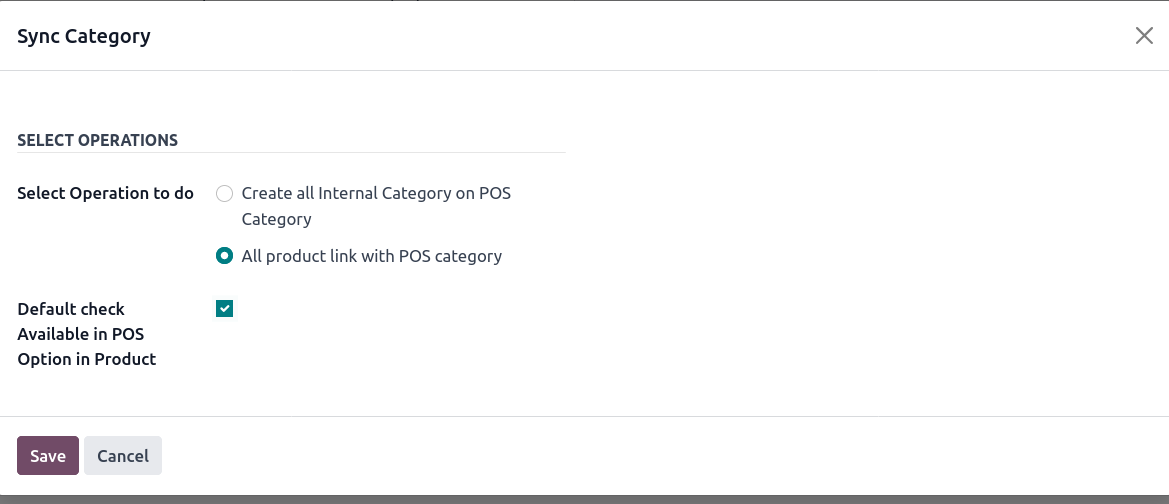 When you select second operation then one checkbox 'Default check Available in POS Option in Product' will be visible, this checkbox used to check option 'Available in PoS' in product, and click 'Save' then all products category and PoS category will be linked.