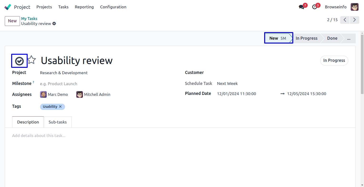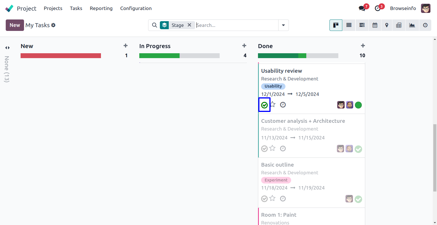 User can also see done task button on tree and kanban view and task moved to done stage.