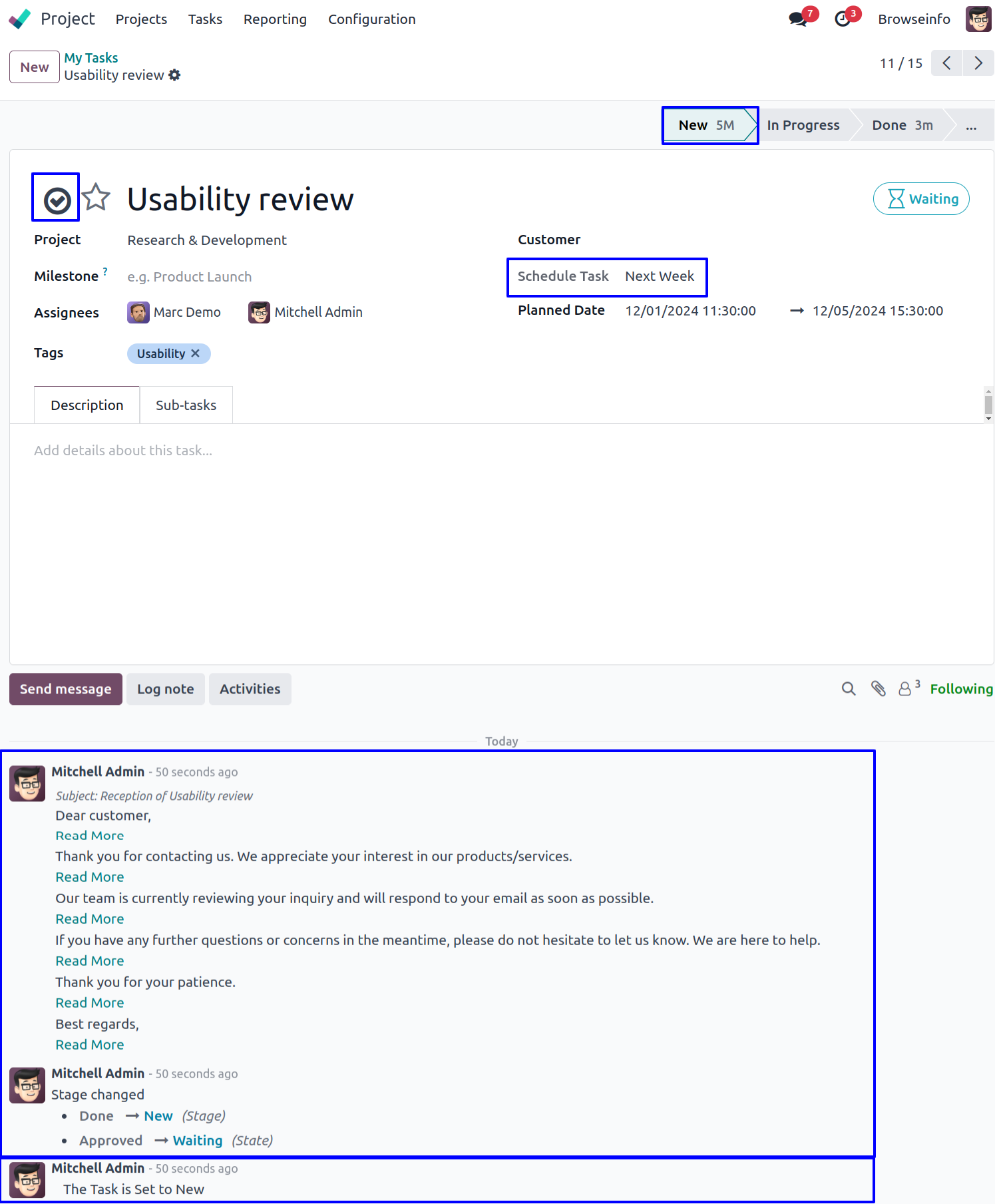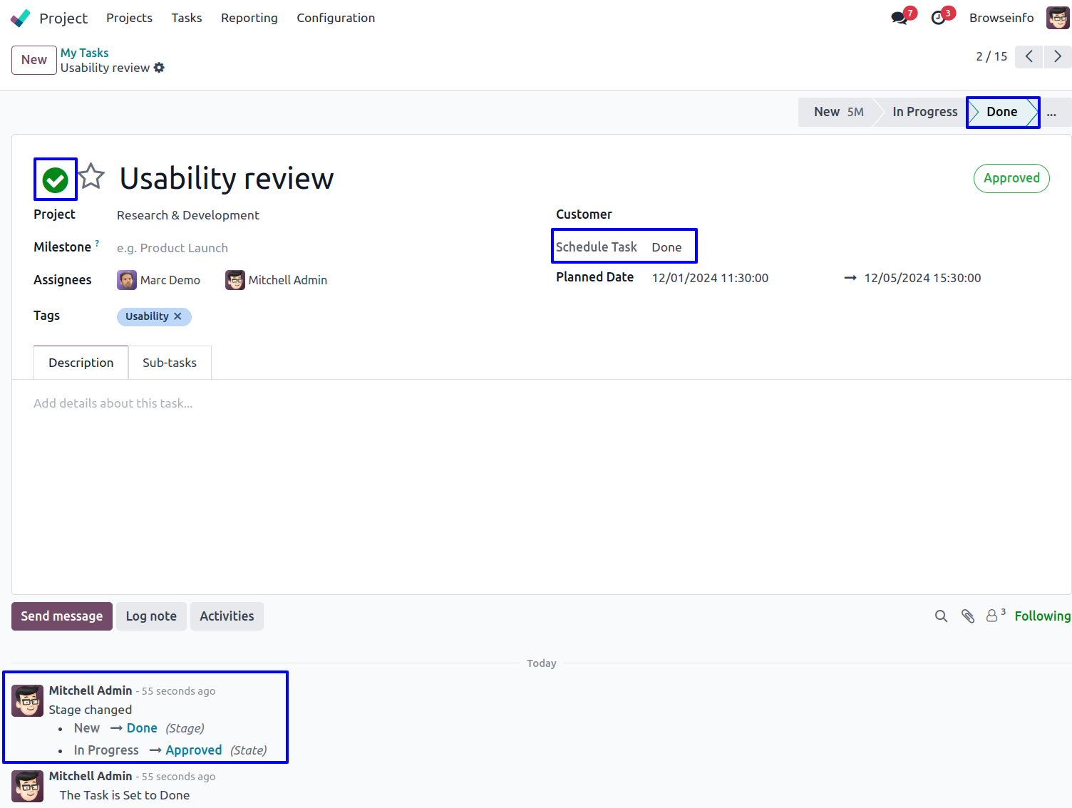 User can see button is checked and task moved to "Done" stage, user can see message on chatter also.