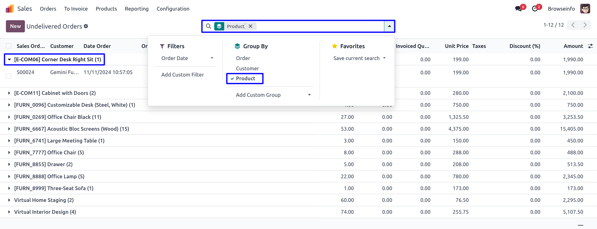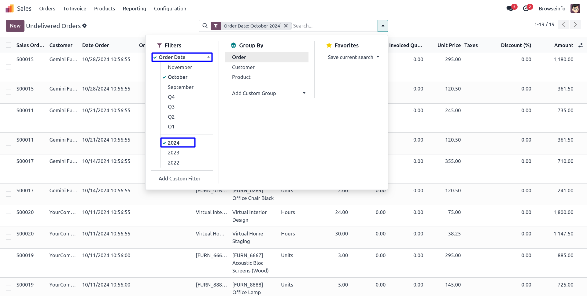 Filter Undelivered Sales Order odoo app is used for users to quickly find undelivered sales orders using menu and filters . Users can see all undelivered sales order line and quantity, invoiced quantity and delivered quantity of sales order. Users can filter undelivered sales orders by order date, also users can group by undelivered sales order with order, order customer and order products etc.