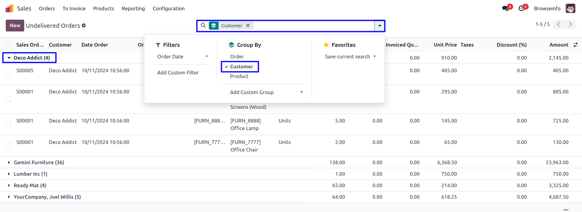 User Can filter undelivered order by order dates, also group by order, customer and products.