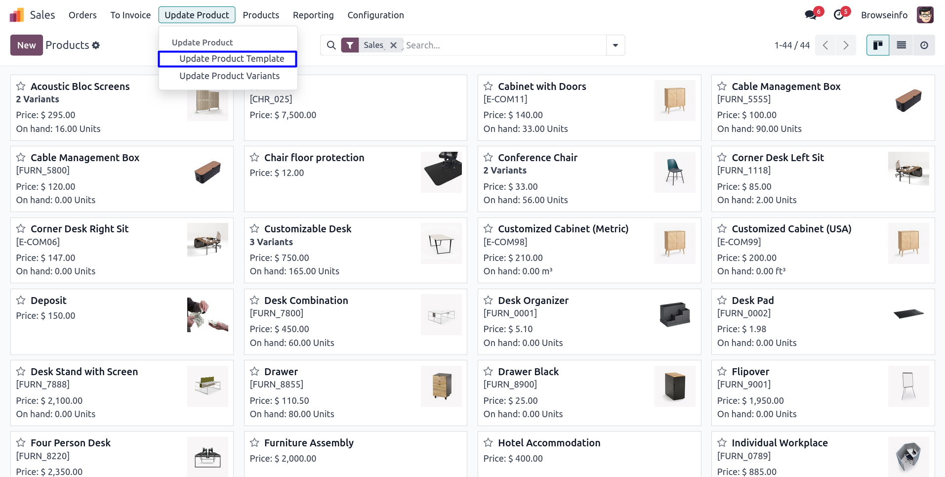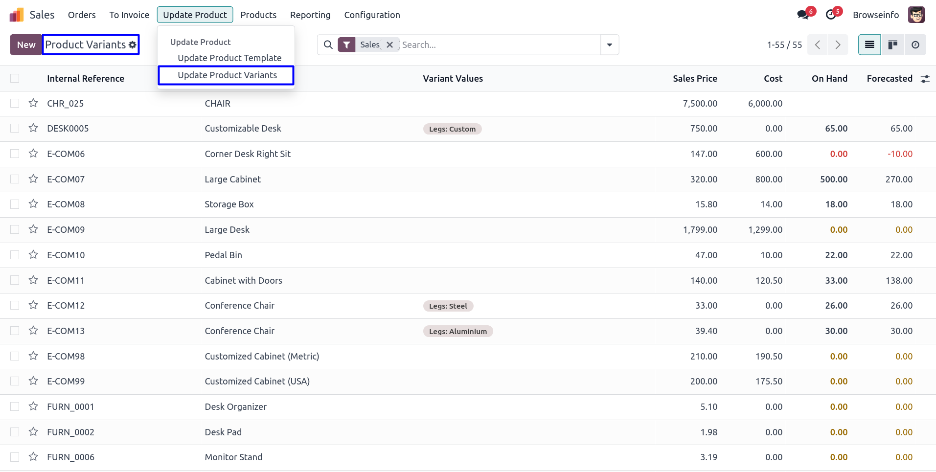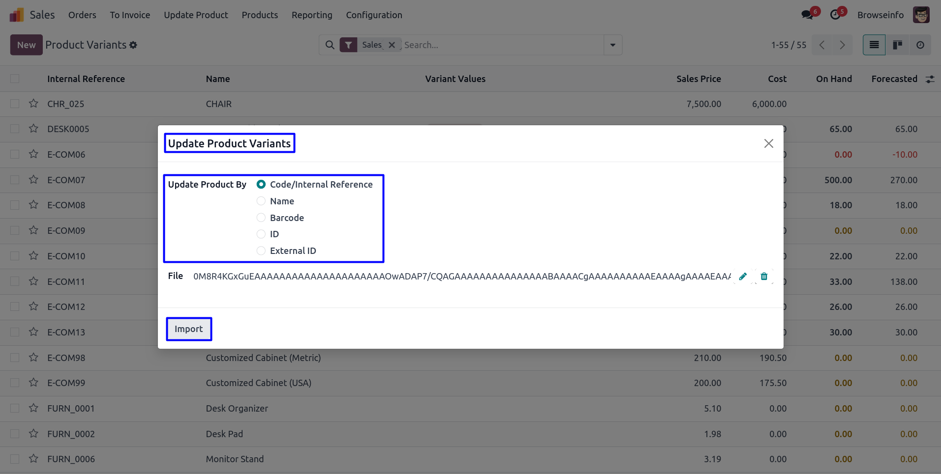 User can update product variants by code/internal reference, barcode, name, id and external id from excel file.