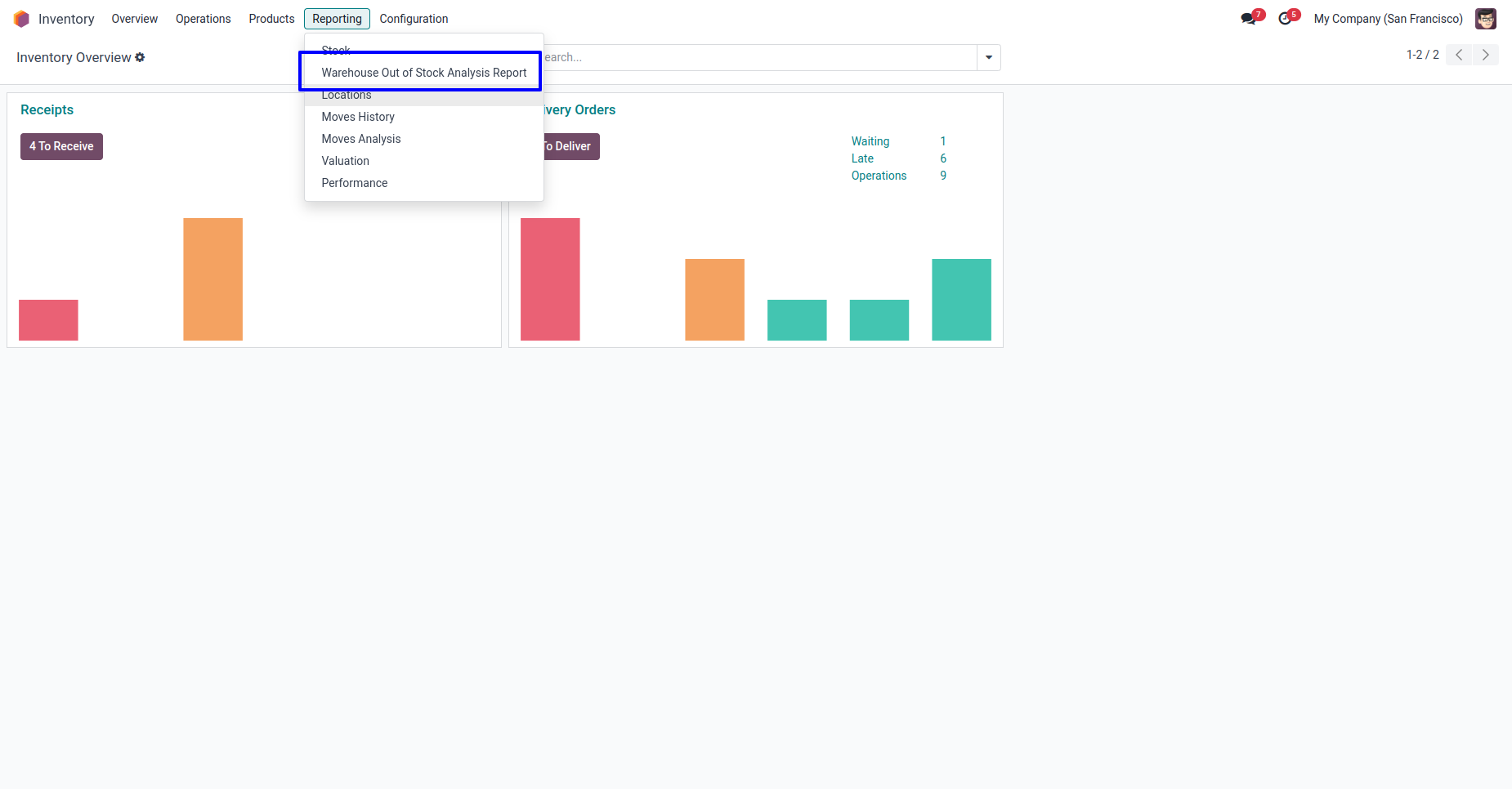 Under Inventory > Reporting menu user can see "Warehouse Out of Stock Analysis Report" menu.