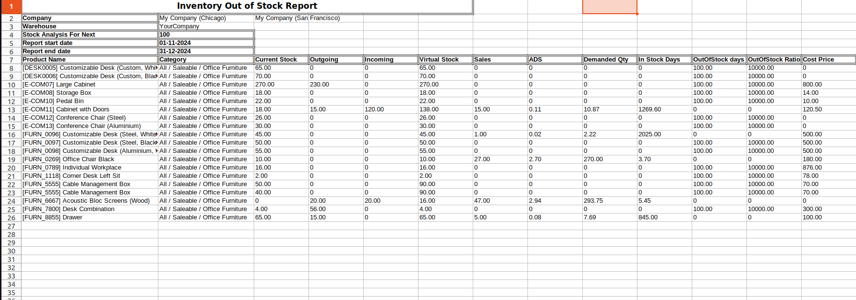 On clicking the "EXCEL REPORT" button user can see generated out of stock excel report as below image.