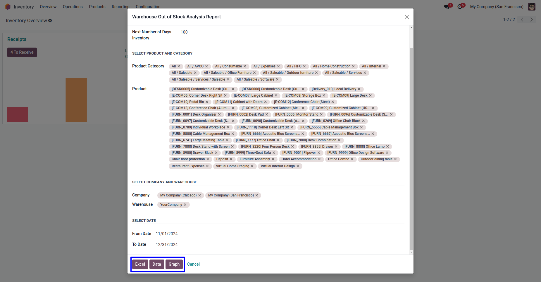 Warehouse Out of Stock Analysis Report odoo app helps users to identify out of stock for the warehouse. Users can identify sales, ads, incoming, outgoing and current stock, overstock value, overstock quantity, turnover ratio, out of stock quantity and out of stock days with fast moving, slow moving and non moving products from the warehouse. This report helps the warehouse manager to make proper decisions. Users can print warehouse out of stock analysis reports using different filters like, date, product and product category, company and warehouse and view out of stock analysis report, graph view and also can print report in excel format.