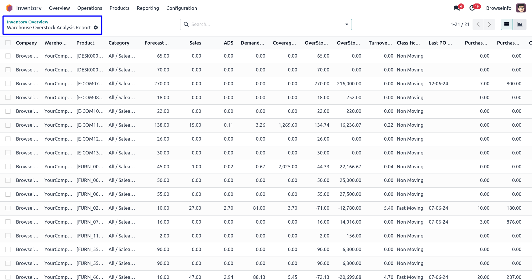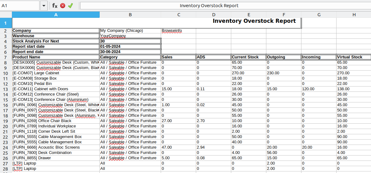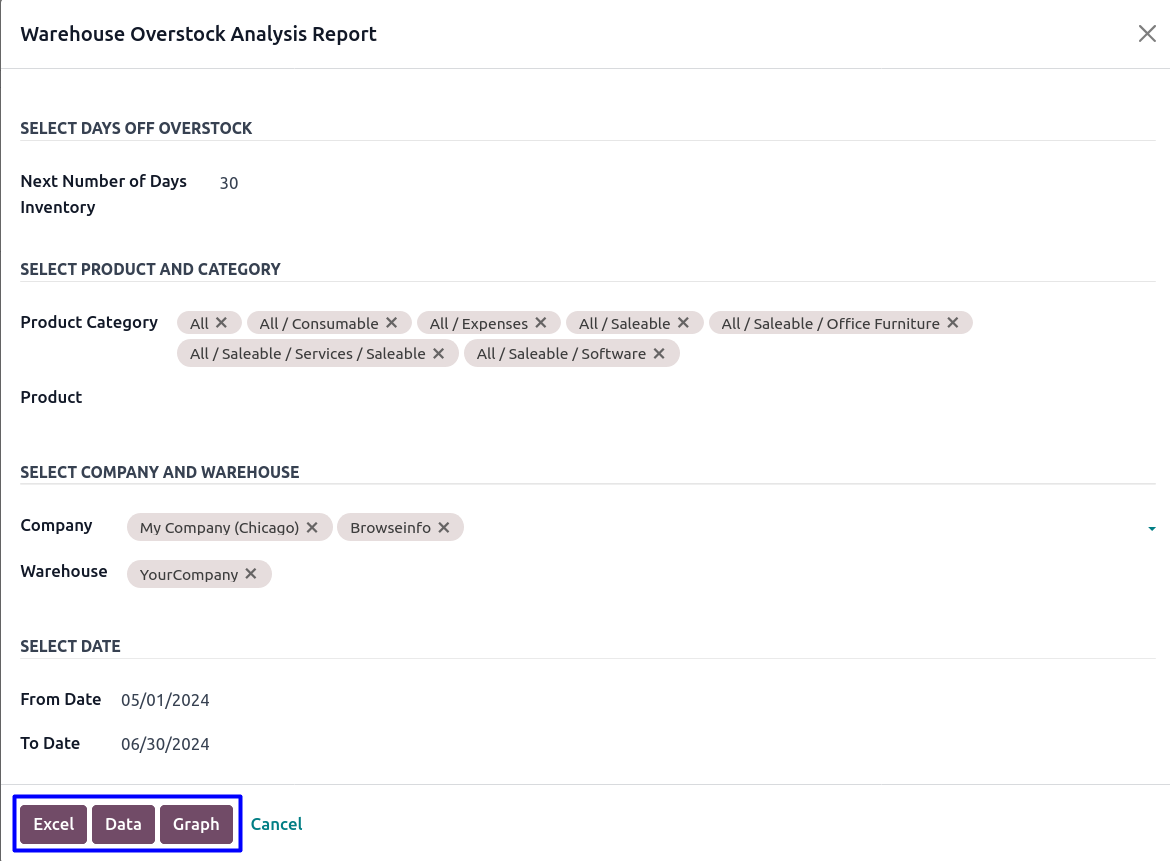 Inventory Overstock Analysis/PDF/Excel Reports odoo app helps users to generate product overstock reports for each warehouse .This reports helps to identify incoming, outgoing and current stock, overstock value, overstock quantity, turnover ratio fast moving, slow moving and non moving product from warehouse. Users can print warehouse overstock reports using different filters such as date, product and product category, company and warehouse and easy to view overstock analysis report, graph view and also can print reports in excel format.