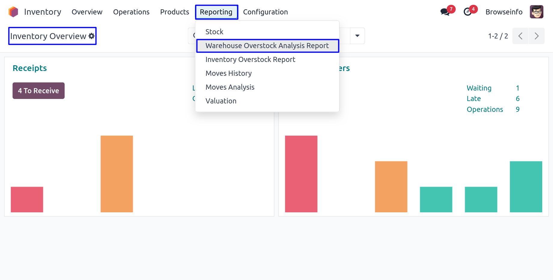 Under Inventory > Reporting menu user can see "Warehouse Overstock Analysis Report" menu.