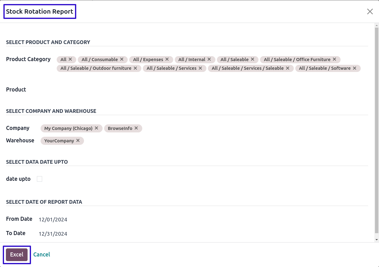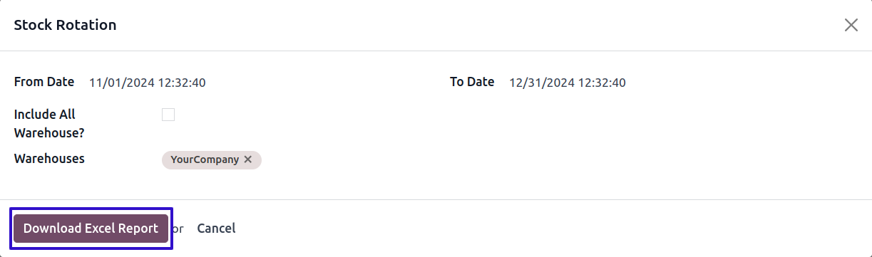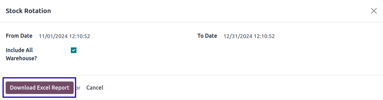 On clicking menu new wizard will open user can select from and to date, enable "Include All Warehouse?" option and click "DOWNLOAD EXCEL REPORT" button.