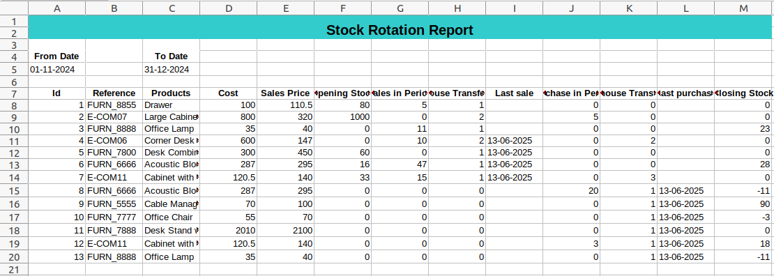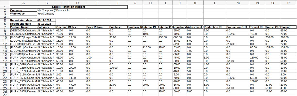 Inventory Movement & Rotation Analysis Excel Report odoo app helps users to identify warehouse stock rotation for products. Users can see total sale, sales return, purchase, purchase return, internal In-Out, adjustment In-Out, production In-Out, transit In-Out, and closed stock. Users can generate warehouse stock rotation reports with different filters like product and product category, users also can generate reports for all warehouses or a specific selected warehouse.