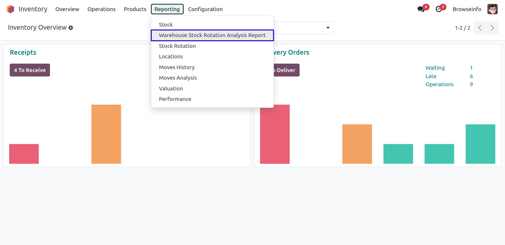 Under Inventory > Reporting menu user can see "Warehouse Stock Rotation Analysis Report" menu.