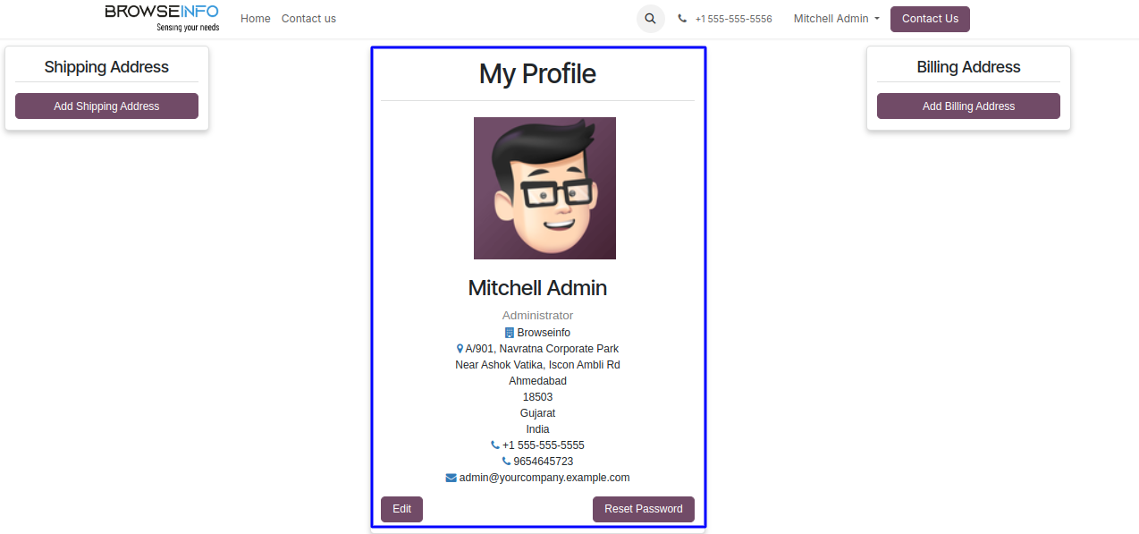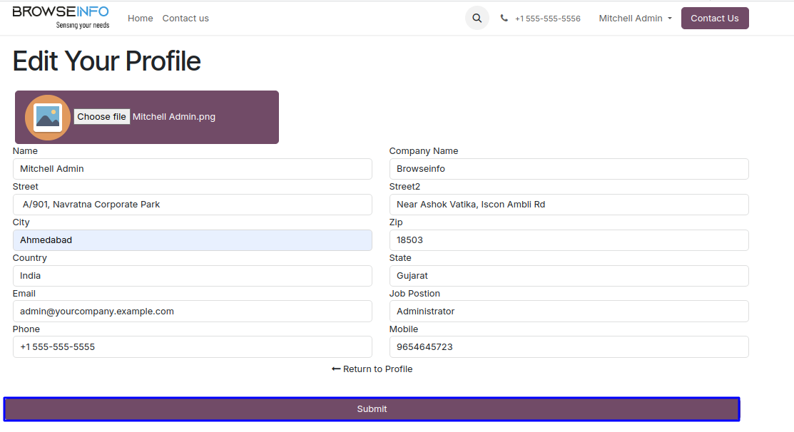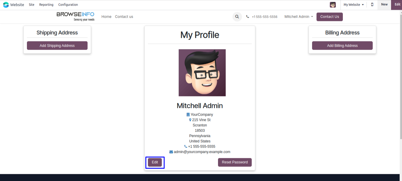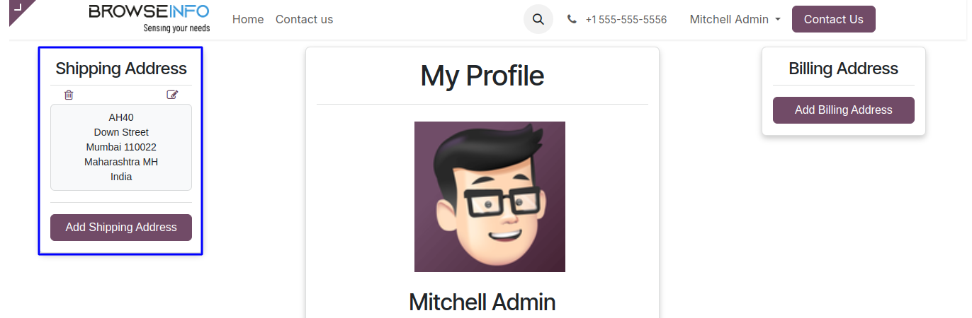 This odoo app enables users to update their profile in Website. When logged in to the website, User will be able to see their Profile also website portal User can able to edit profile along with profile picture, personal details and Address etc. User has access to change and edit their shipping and invoice address from the My Account portal page.