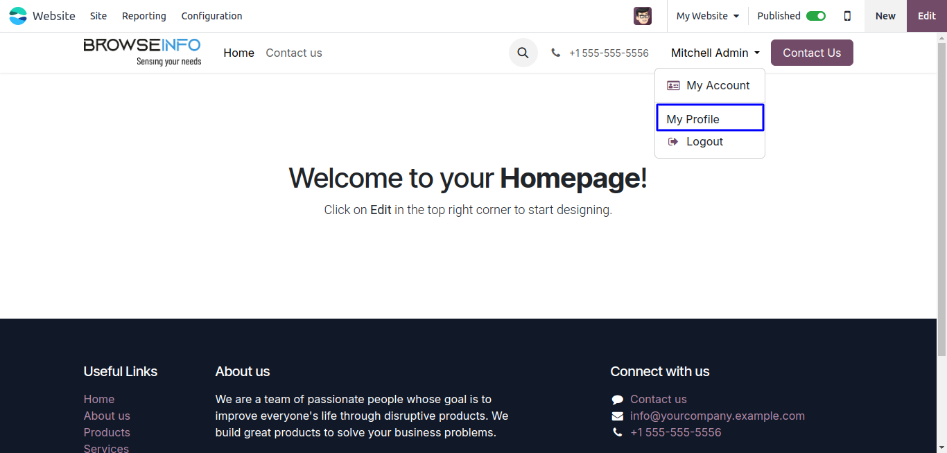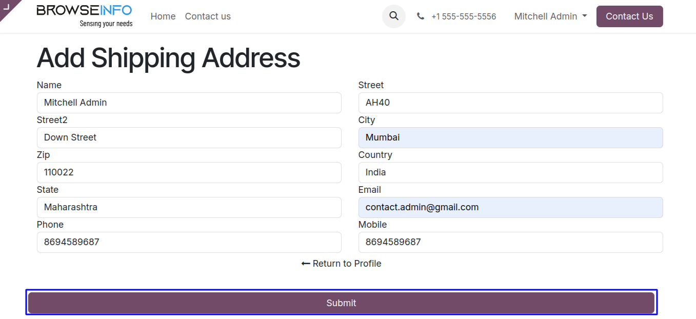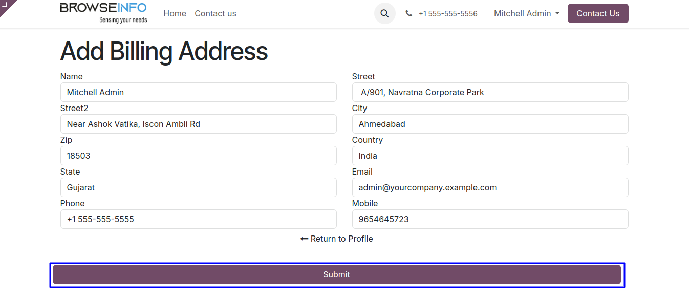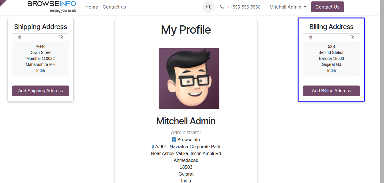 This odoo app enables users to update their profile in Website. When logged in to the website, User will be able to see their Profile also website portal User can able to edit profile along with profile picture, personal details and Address etc. User has access to change and edit their shipping and invoice address from the My Account portal page.