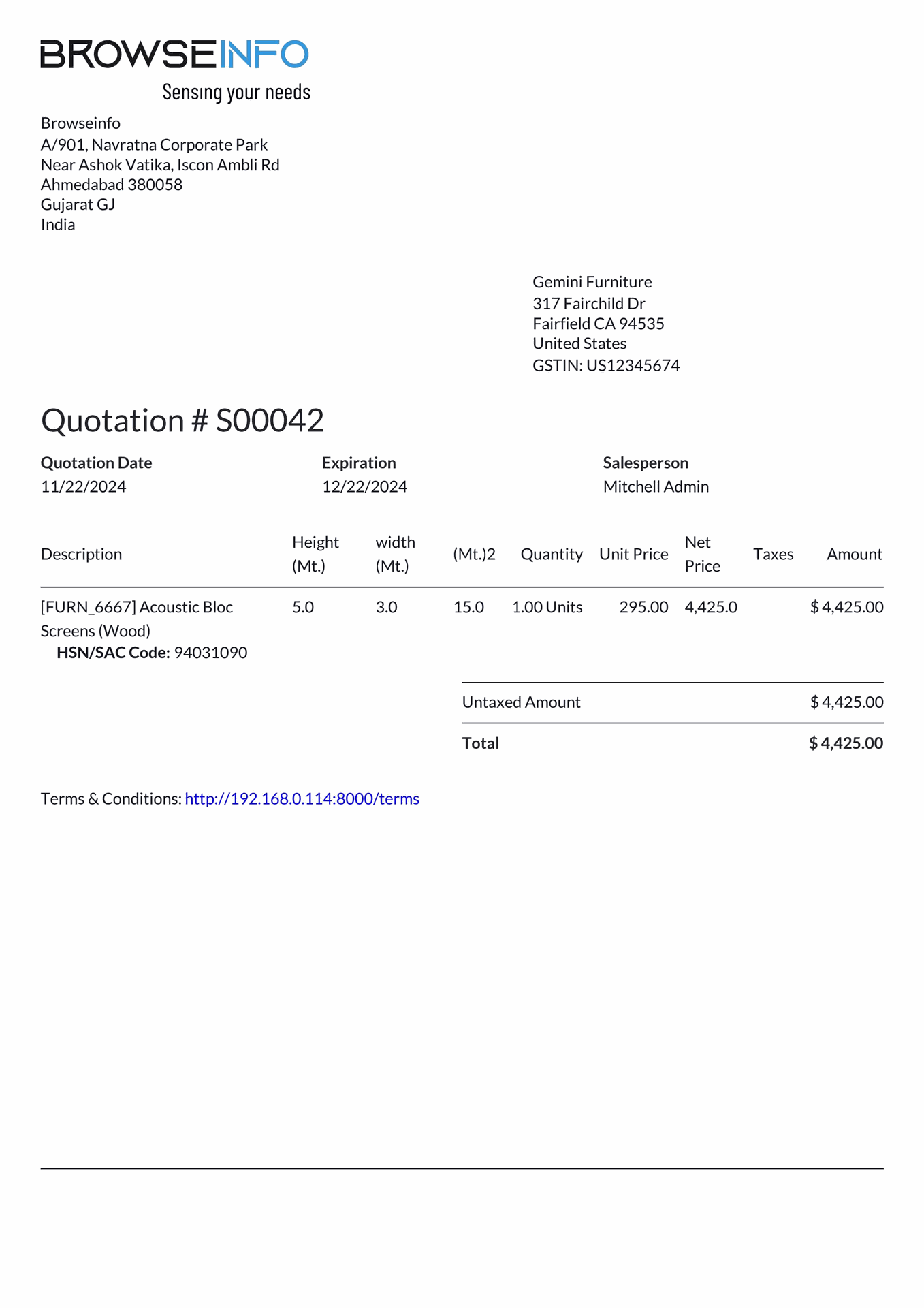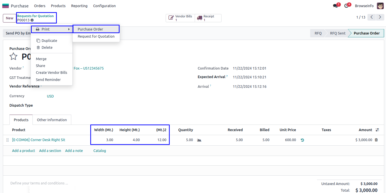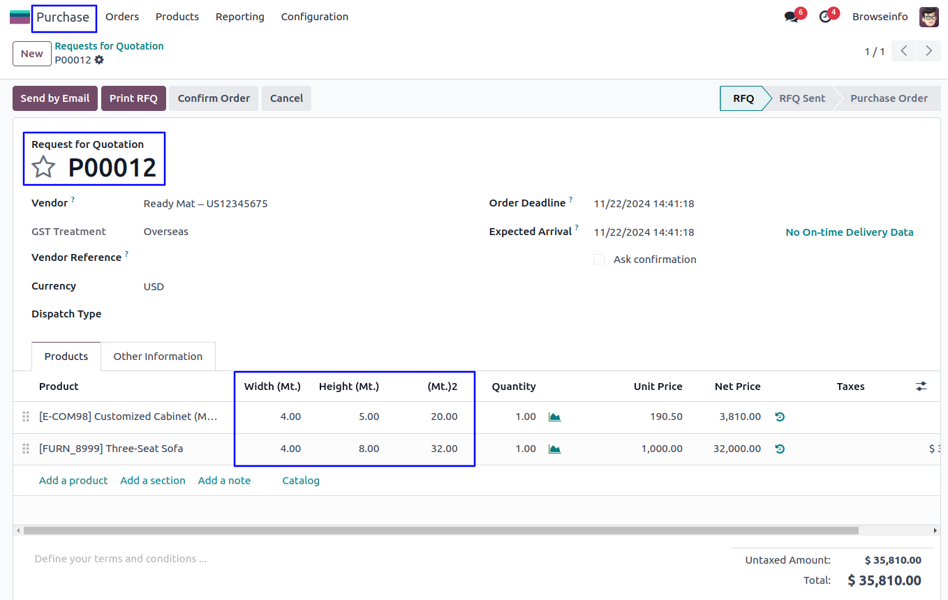 When purchase generated by the purchase user, purchase user can add height(Mt.) and width(Mt.) of product in order line and based on that (Mt.)2 price will be calculated according to its height and width. Also Same will be automatically effected when Purchase has been generated from the sales order(by confirm sales).