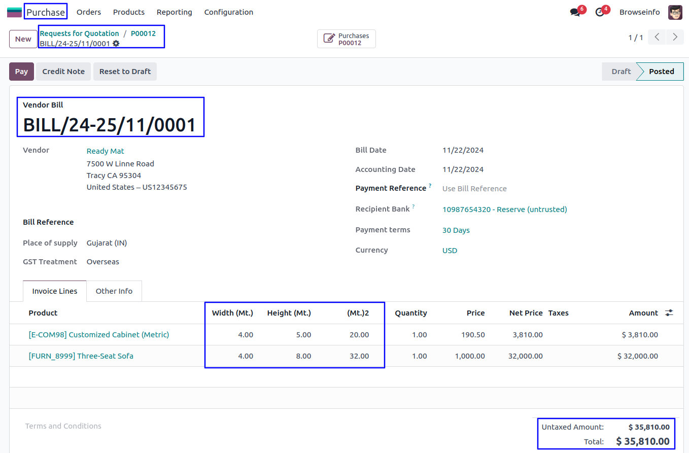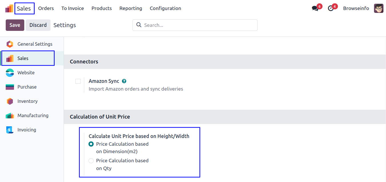 This odoo app helps user to add product dimension like product height and product width from website, User also have option to calculate price based on that height and with or quantity. User can also add height and width measurement for product in website, sale order, purchase order, customer invoice, vendor bill, and manufacturing order.