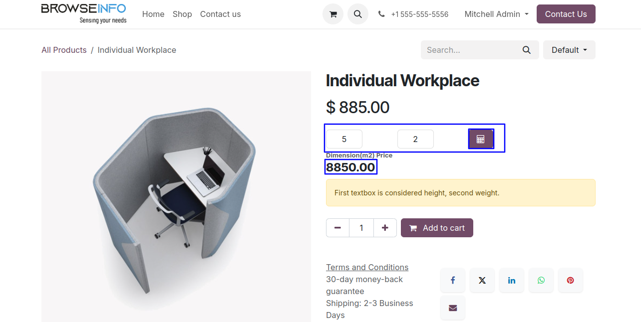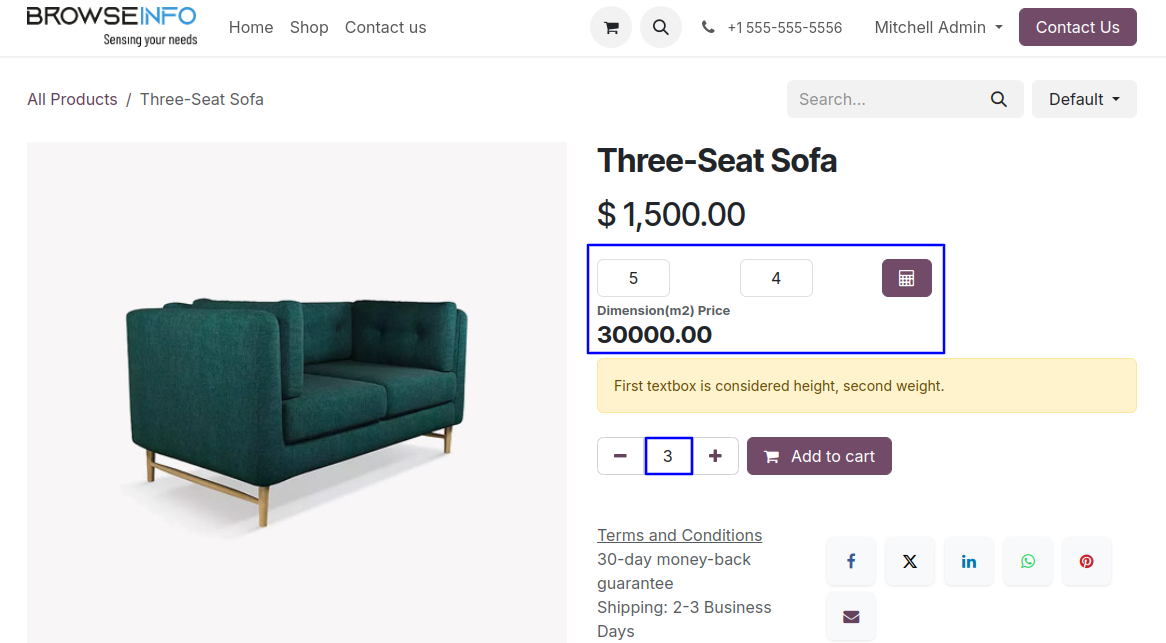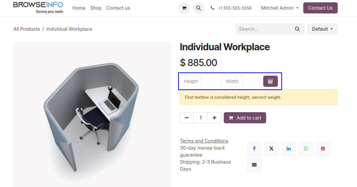 Website Product Dimension app helps you to add product measurement variable height and width on product, based on that it will dynamically calculate Quantity of Product in Meter Square and Price of it. This plugin will be mainly useful for Banner and Paper industry , where customer can order product in different dimension with different height and width and based on that price need be calculated for that product size.This app works for Shop, Sales, Purchase, Accounting and Manufacturing.