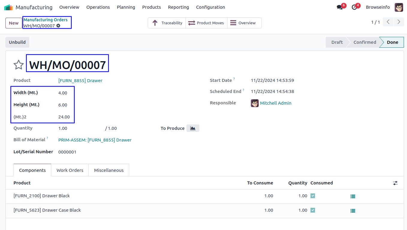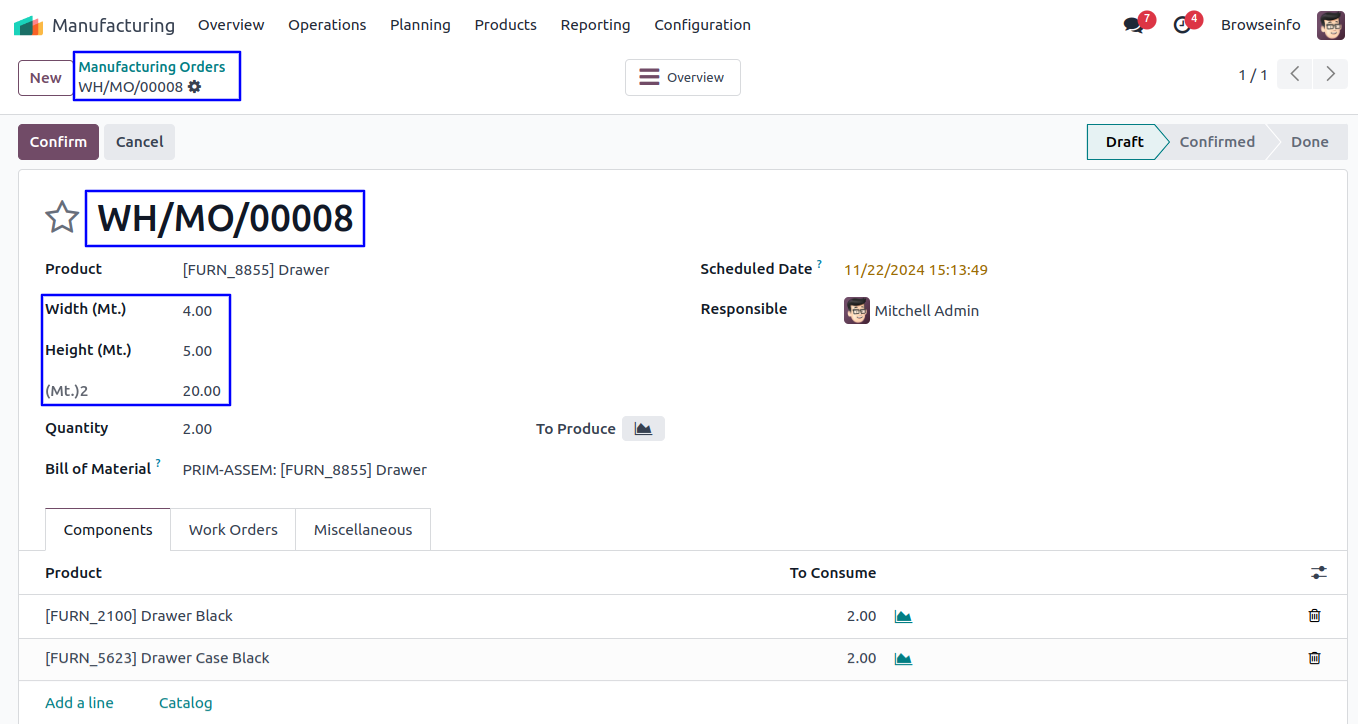 When Manufacturing order created by the production user , production user can add height(Mt.) and width(Mt.) of main product on manufacturing order and based on that (Mt.)2 price will be calculated according to its height and width. Also Same will be automatically effected when manufacturing has been generated from the sales order(by confirm sales).