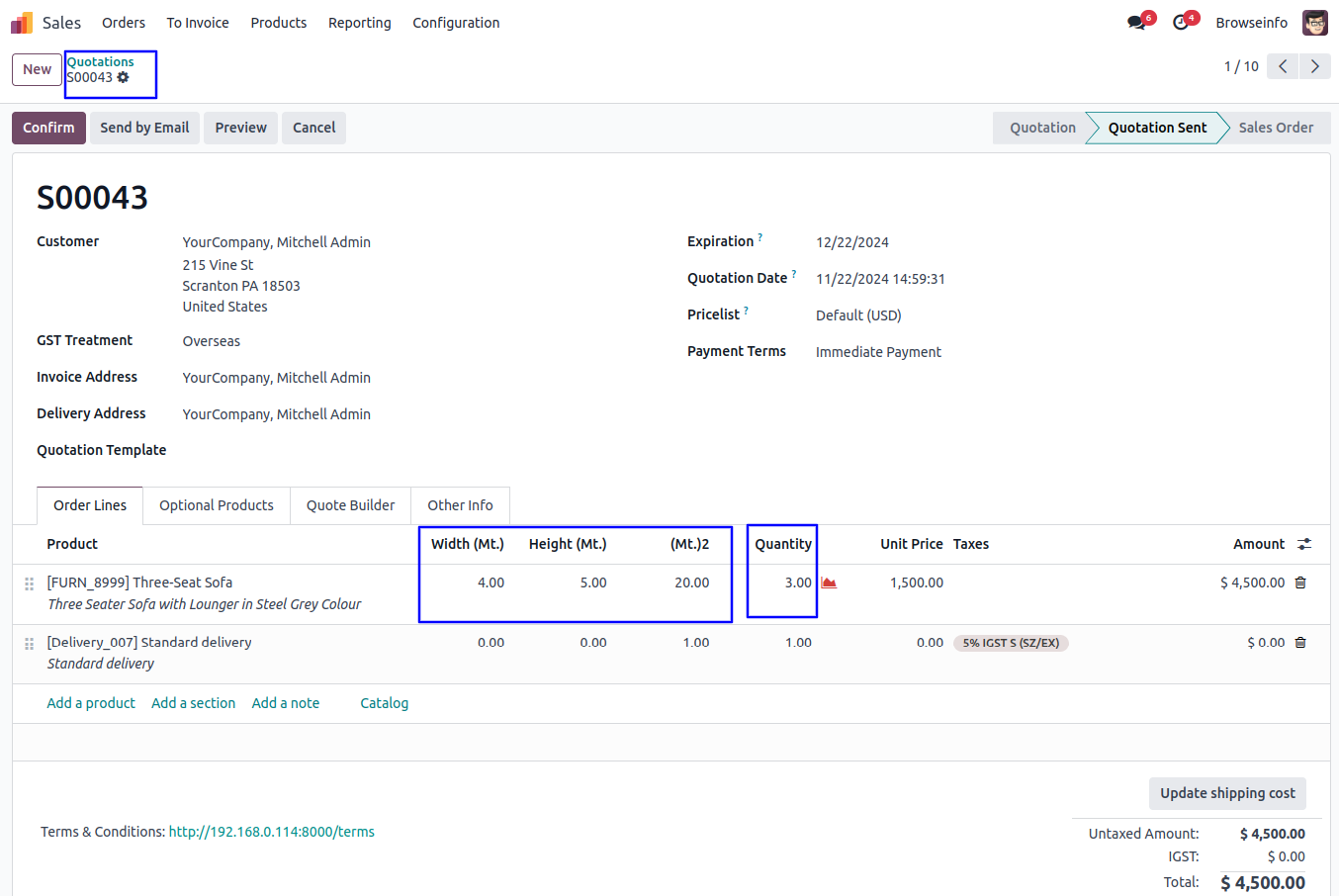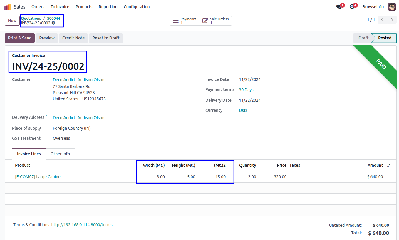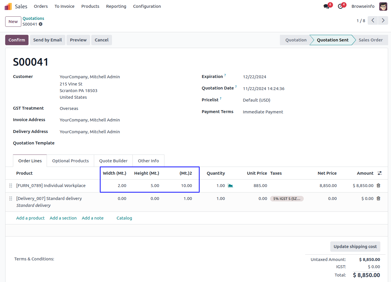 Automatically calculates product UOM (Mt.)2 based on height and width.