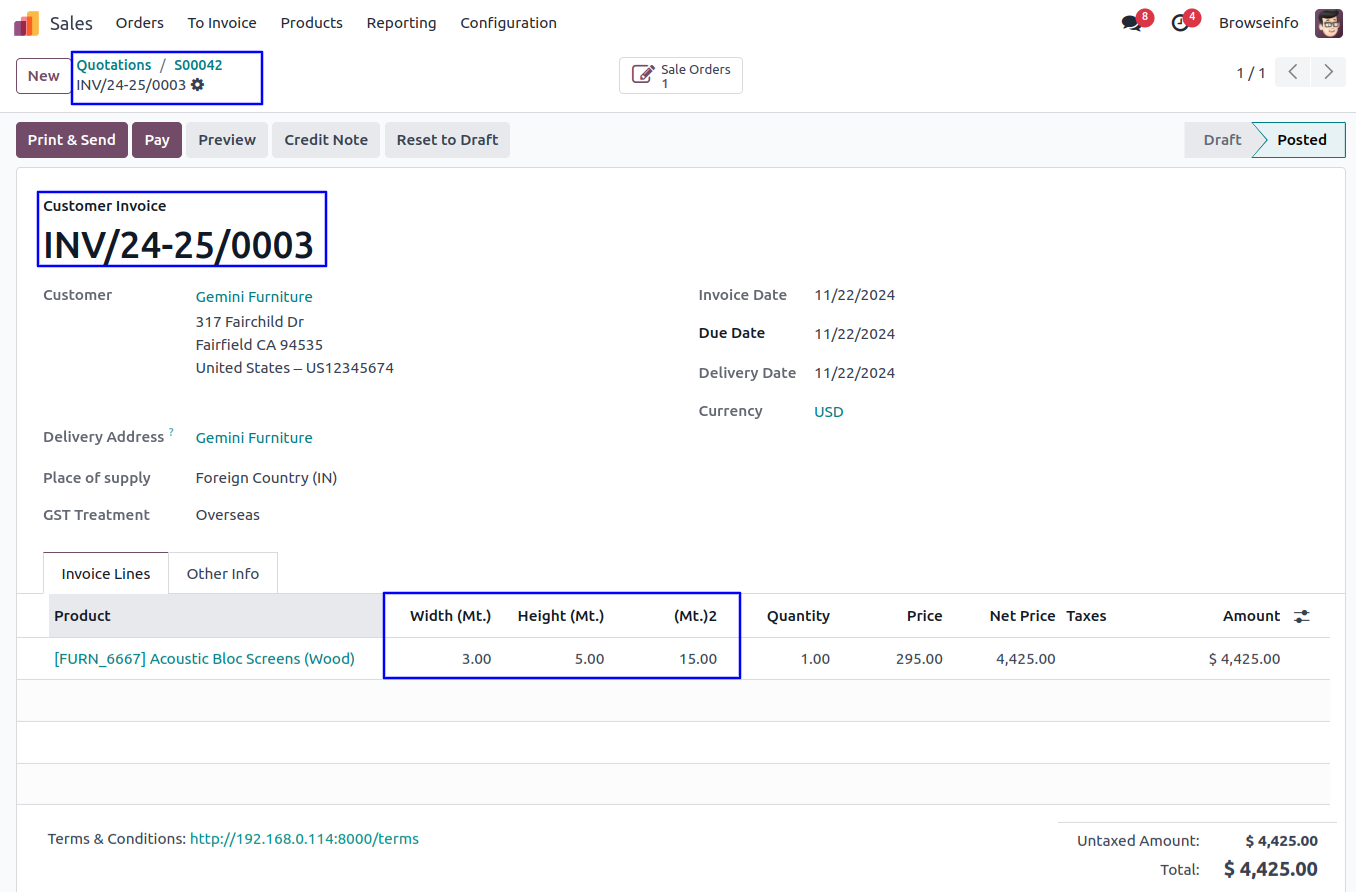 While invoice created from the sales order same height(Mt.)/width(Mt.) will be passed on invoice line for product. Also billing user can add height and width of product in invoice line.
