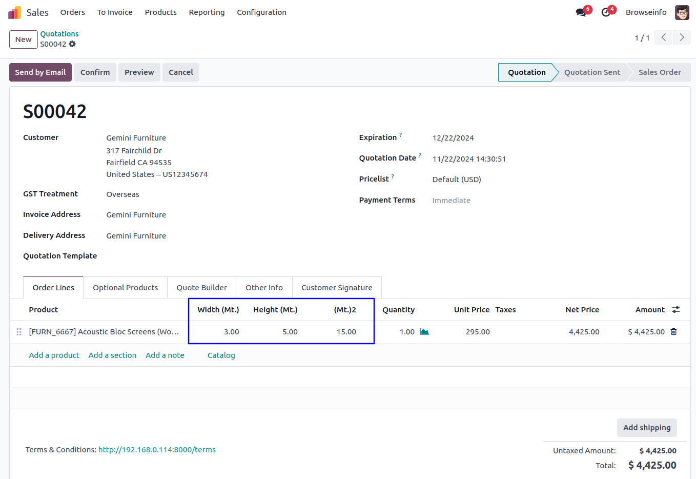 While creating Quotation, Salesman can add height(Mt.) and width(Mt.) of product in order line, by default "Sale Price for (M2)" selected on order line.