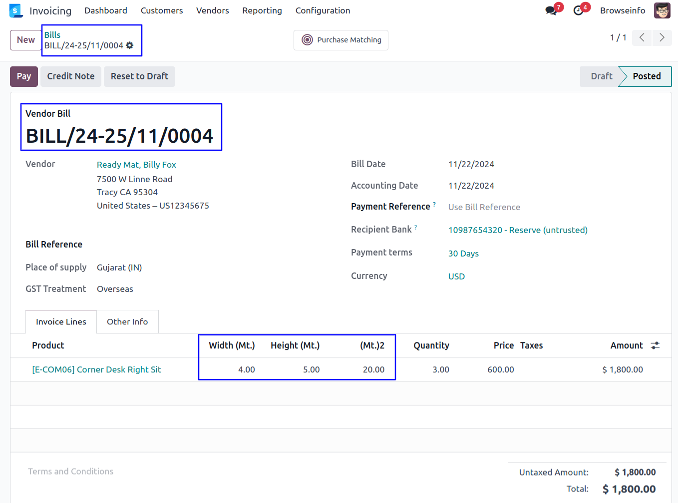 While supplier invoice created from the purchase order same height(Mt.)/width(Mt.) will be passed on invoice line for product.