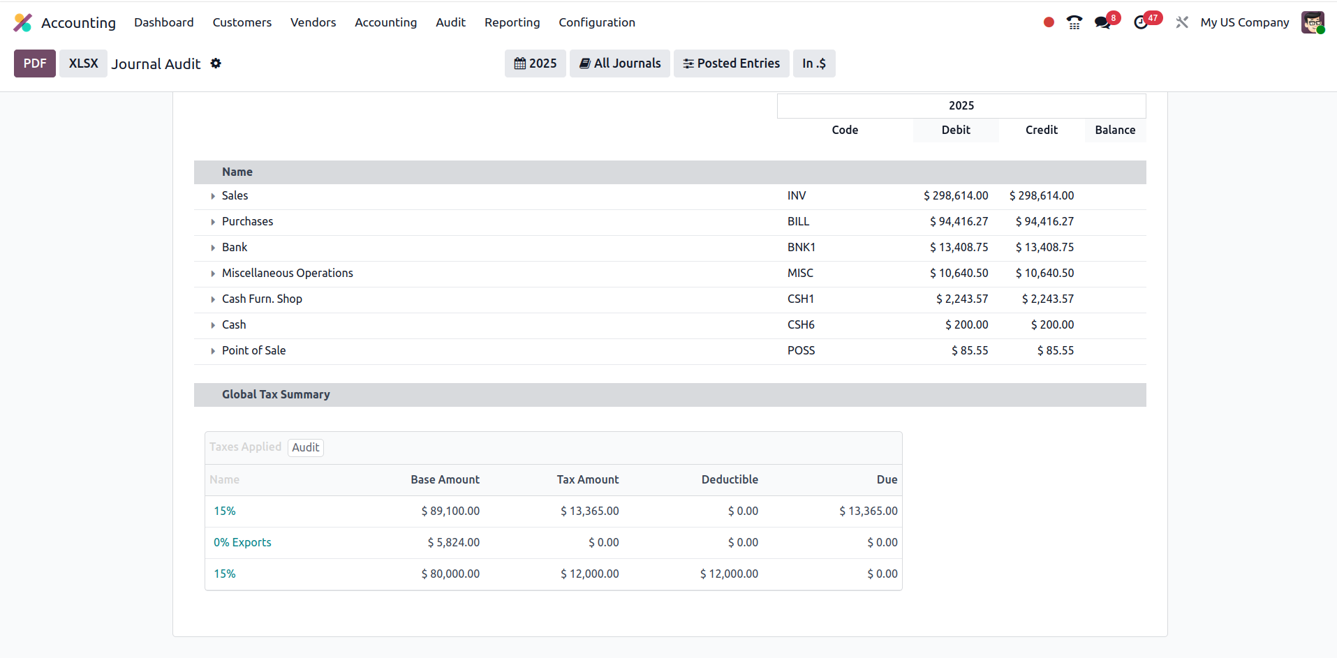 An external auditor requests all journal entries flagged in the last 6 months—Odoo generates a consolidated audit report instantly.