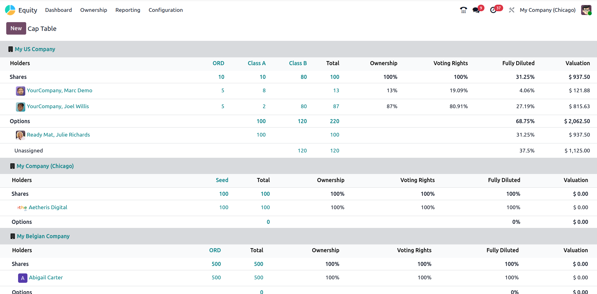For holding companies and business groups, Odoo19 supports multi-company equity management. Each entity has its own cap table, while group-level insights allow consolidated visibility. Switching between companies is seamless, ensuring both independence and centralized control.