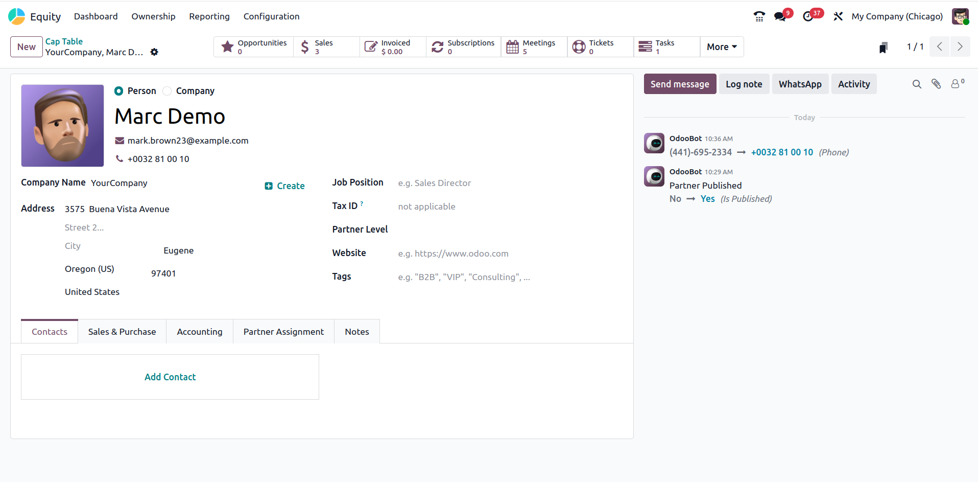 Unlike standalone cap table software, Odoo’s Equity Module is natively integrated into the Odoo ecosystem. It pulls shareholder data directly from Contacts, links equity transactions with Accounting, and stores supporting legal documents in Documents. This unified approach eliminates silos and creates a single source of truth.